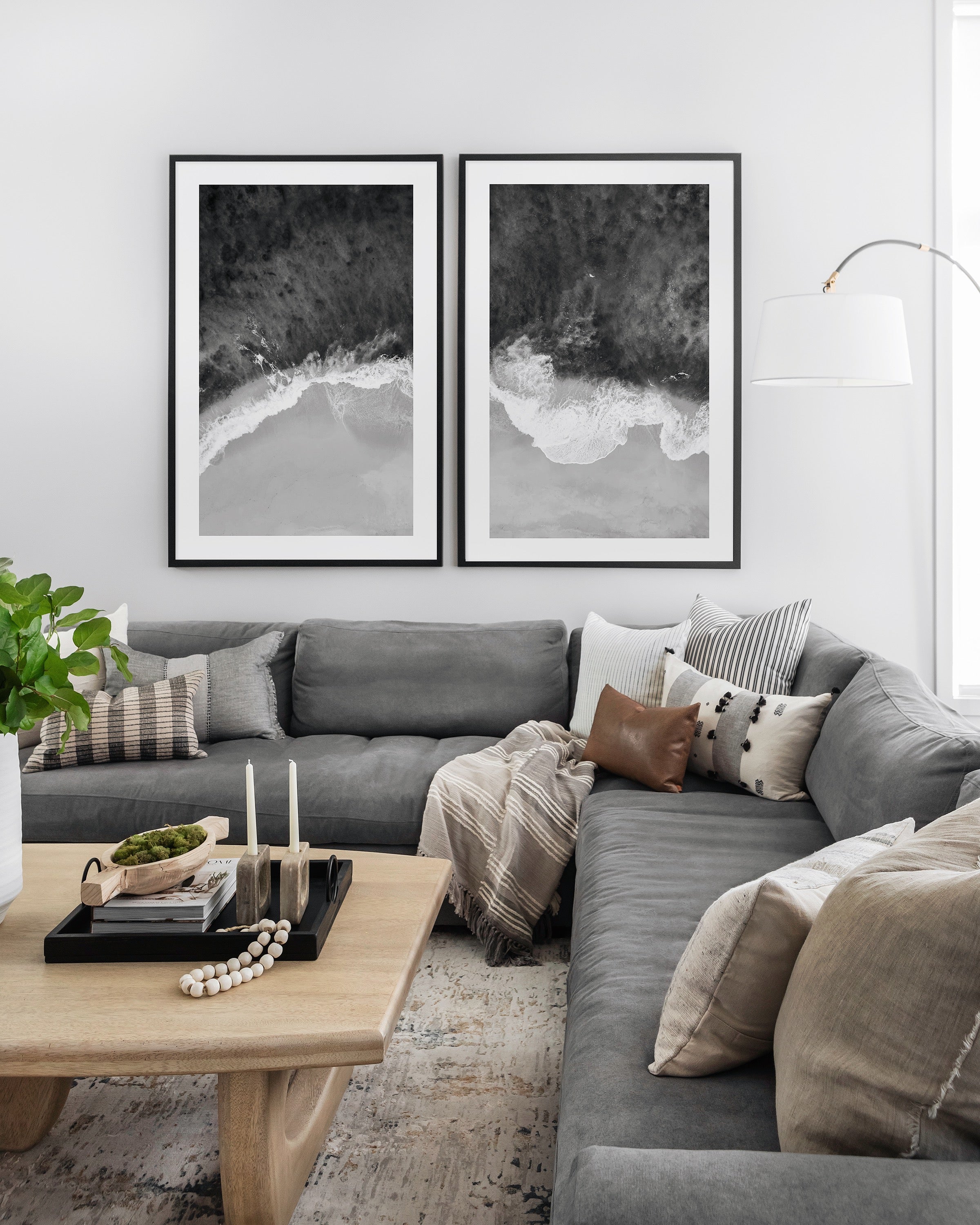 Large scale format diptych framed print of black and white crashing waves. Perfect for a large, high ceiling living room or hallway.