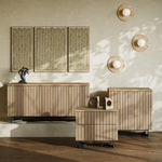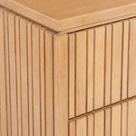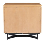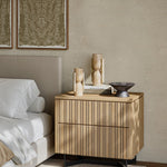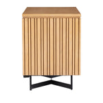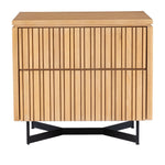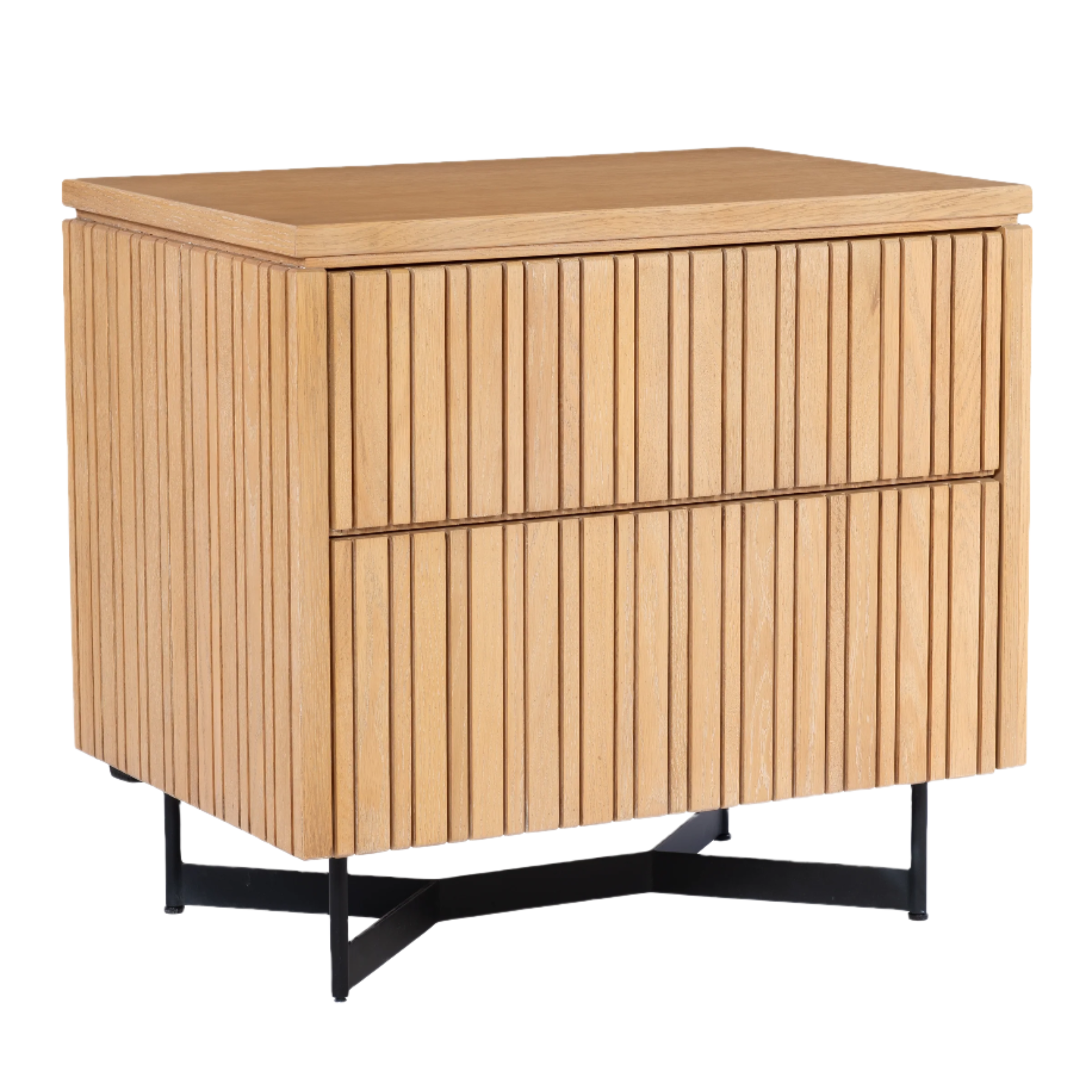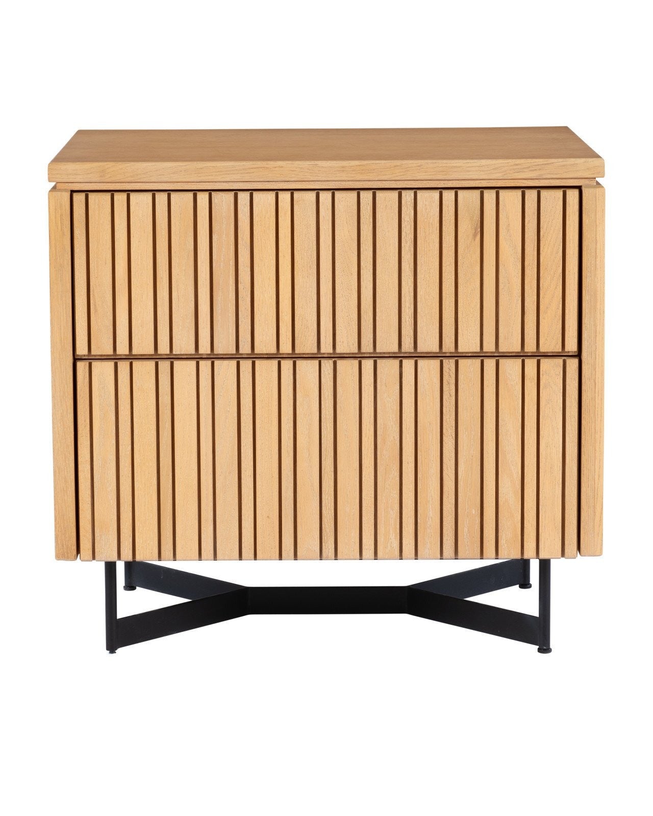 The Indeo Washed Oak Nightstand is an intricate piece of furniture. Made of two sizes of solid oak slats that are clad in oak veneers and inset into the frame, the piece is covered in a washed oak finish. The two-drawer nightstand sits cleverly on iron legs with generously sized stretchers in a black finish. The drawers are push-to-open.