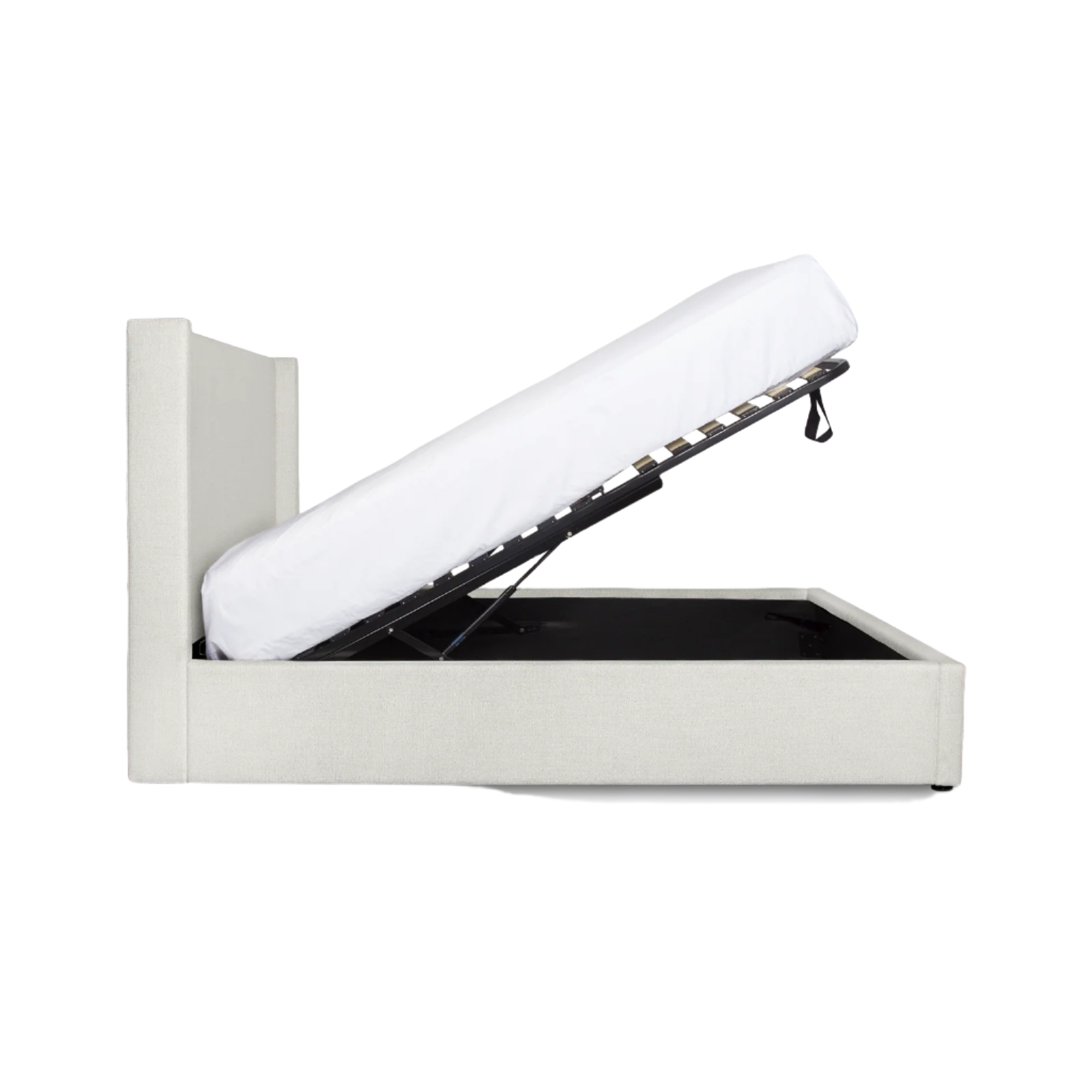 Upholstered in a beautiful woven cream fabric, its slim frame makes it a versatile choice for both cozy condos and spacious homes, all while adding a touch of warmth with its winged headboard design.