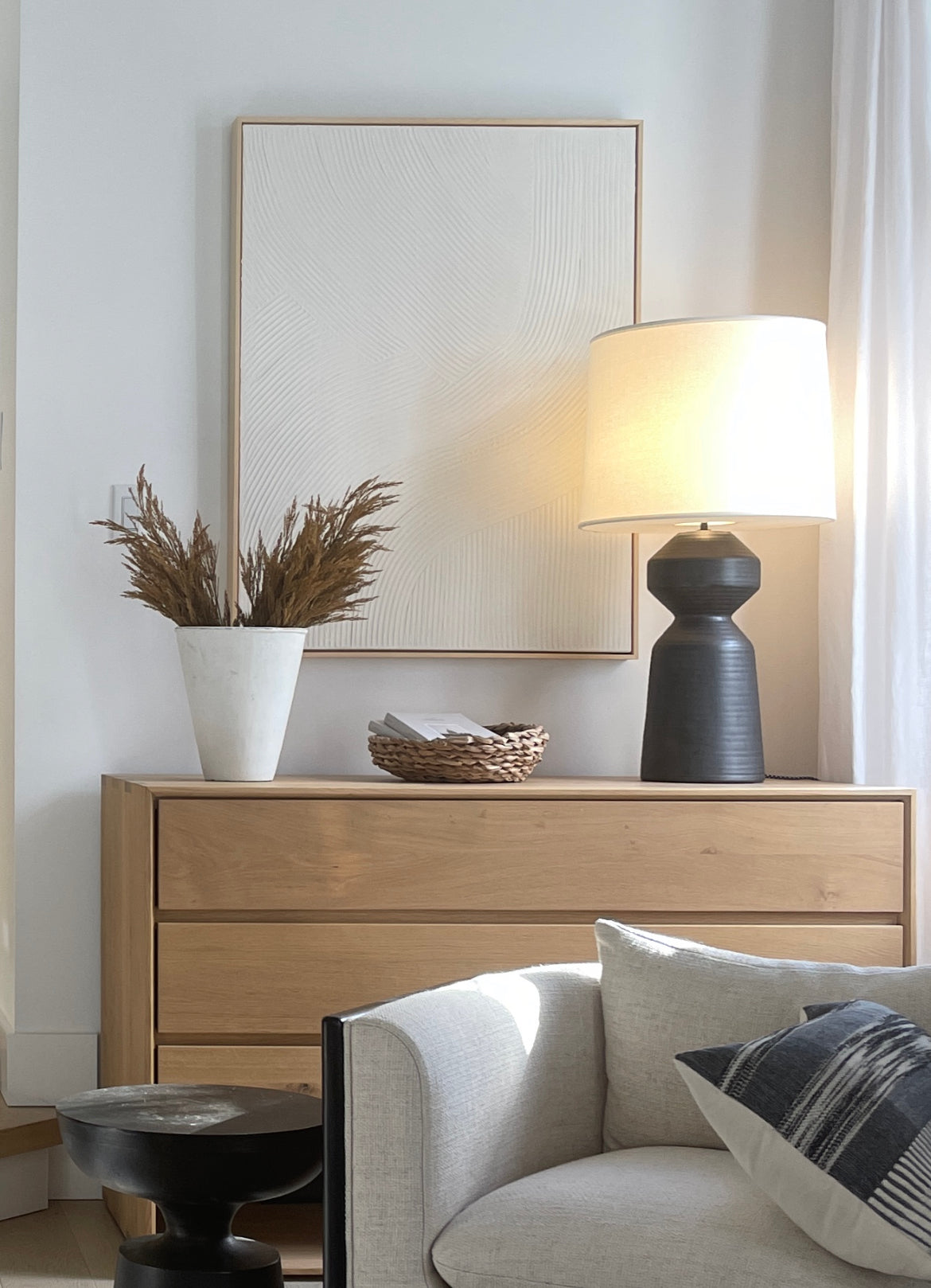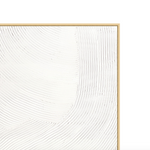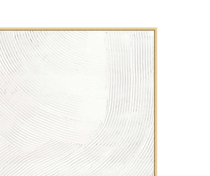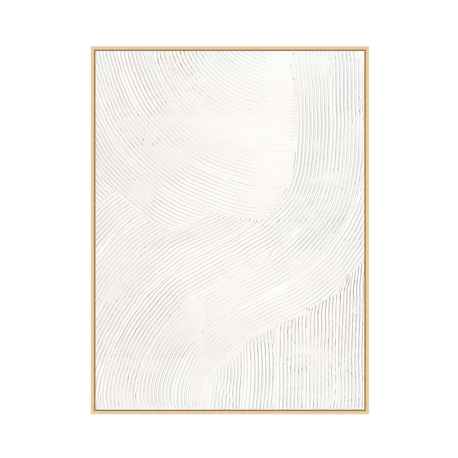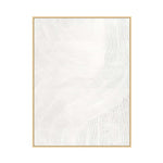 A soft, neautral abstract canvas surrounded by a natural wood frame.