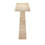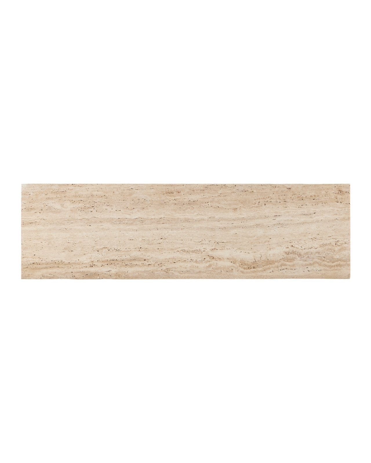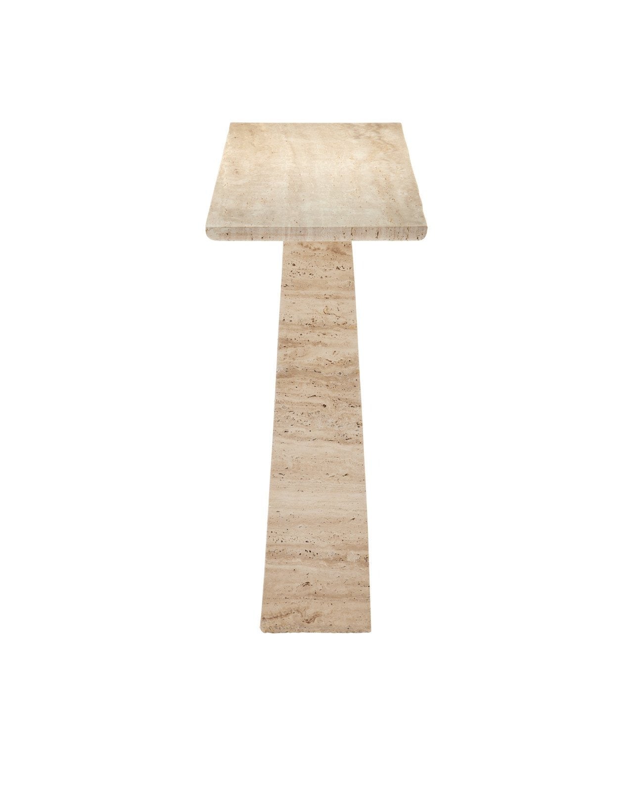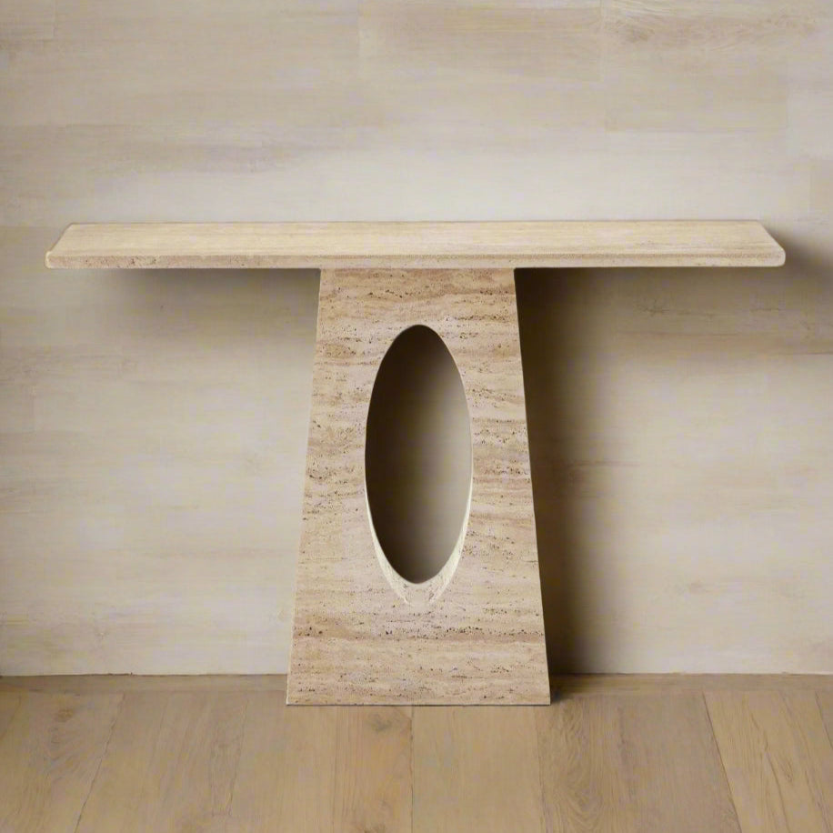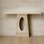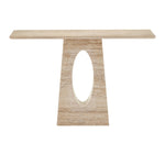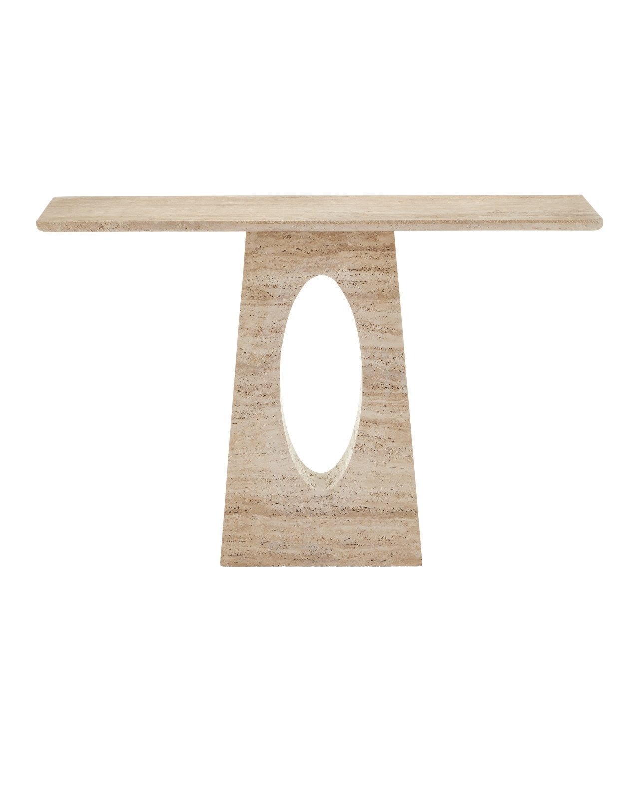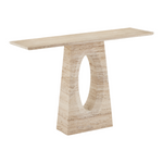 The Demi Travertine Console Table is made of solid travertine. A bevel softens the oval that is carved into the stone on both sides of its pedestal to infuse the tan console table with sophistication, as the cut-out forms an oculus. The way the pedestal tapers to a smaller form toward the top is a shapely design move, as is the chamfered detail under the top. This table has a dynamic personality thanks to the veining in the stone, which means each one will be unique.