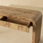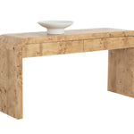 The Rowena Console Table is characterized by its smooth yet sculpted lines that are characteristic of modern design. Sleek and stylish, this burl veneer console table offers unique patterns that are inherent in burl veneer, providing an elevated shape and style.