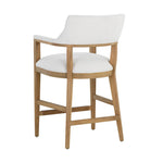 A mid-century modern counter stool with an open back design. Stocked in heather ivory tweed performance fabric with an exposed natural solid oak wood frame. Performance fabric is moisture repellent, stain resistant and easy to clean.