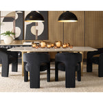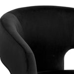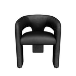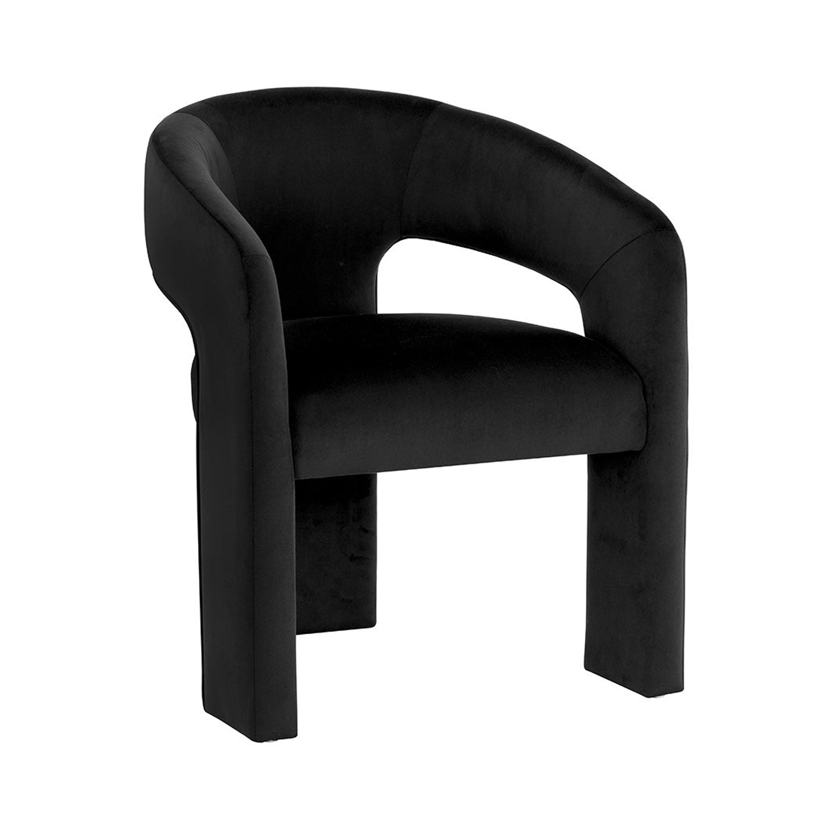 Clean lines and contoured arches add style and structure to this contemporary dining chair. Features a curved backrest and open back for optimal comfort. Eye-catching from all angles. Fully upholstered in our abbington black fabric.