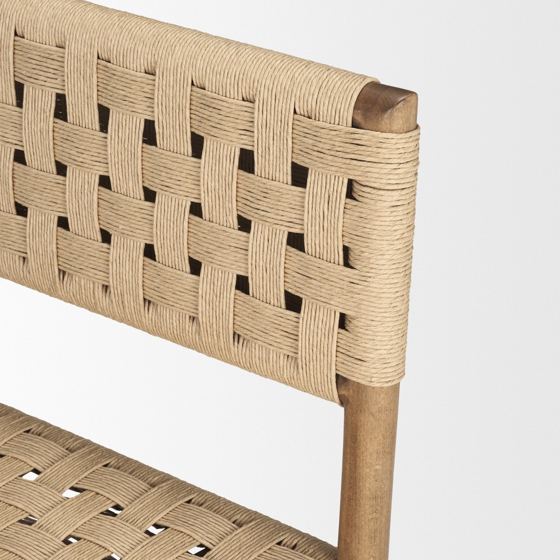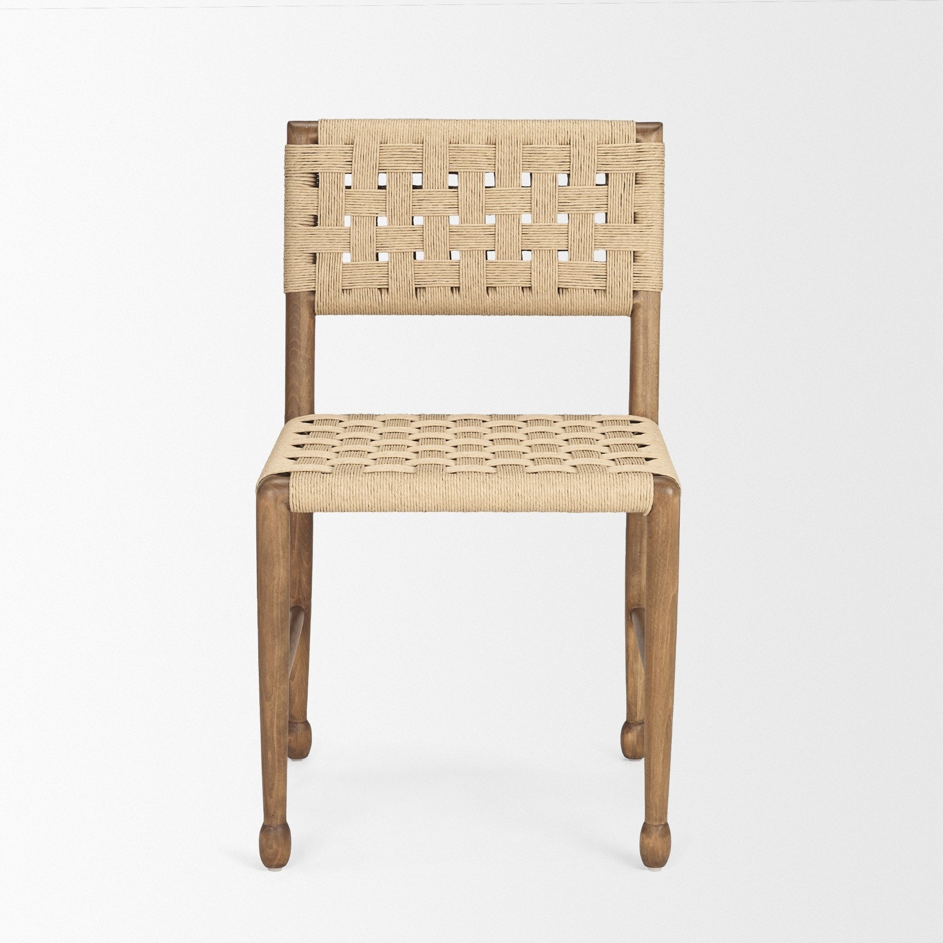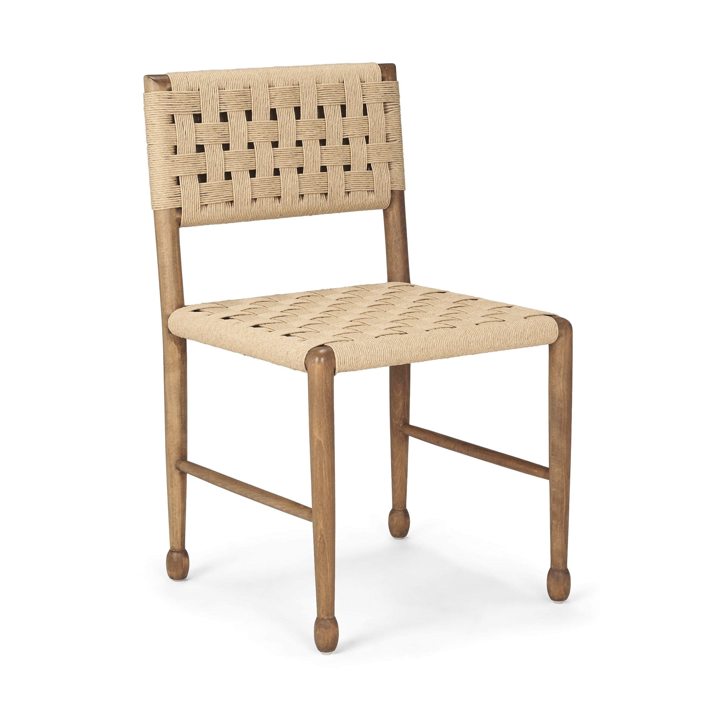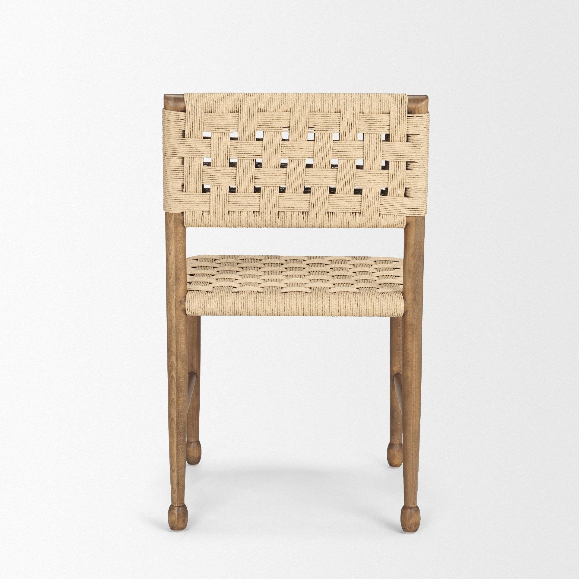 The Montague Dining Chair is crafted from durable natural paper rope, featuring a double-weave seat and backrest on a sturdy brown wooden frame.