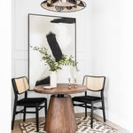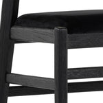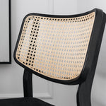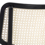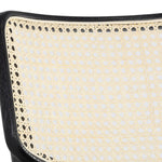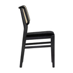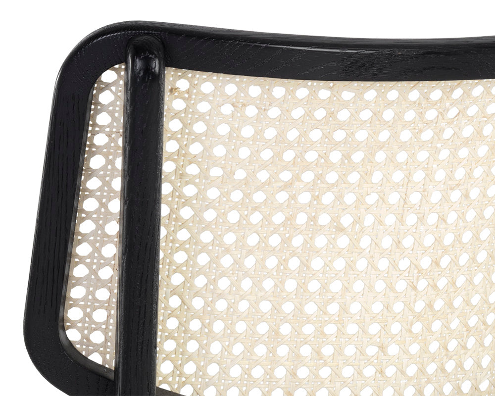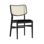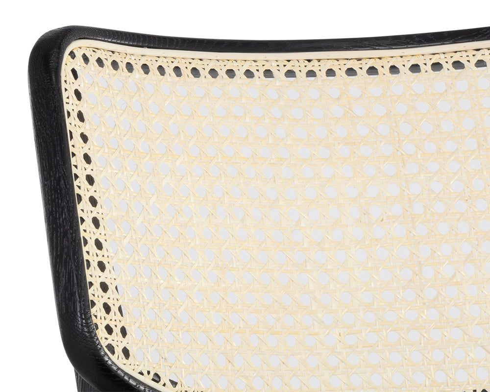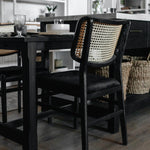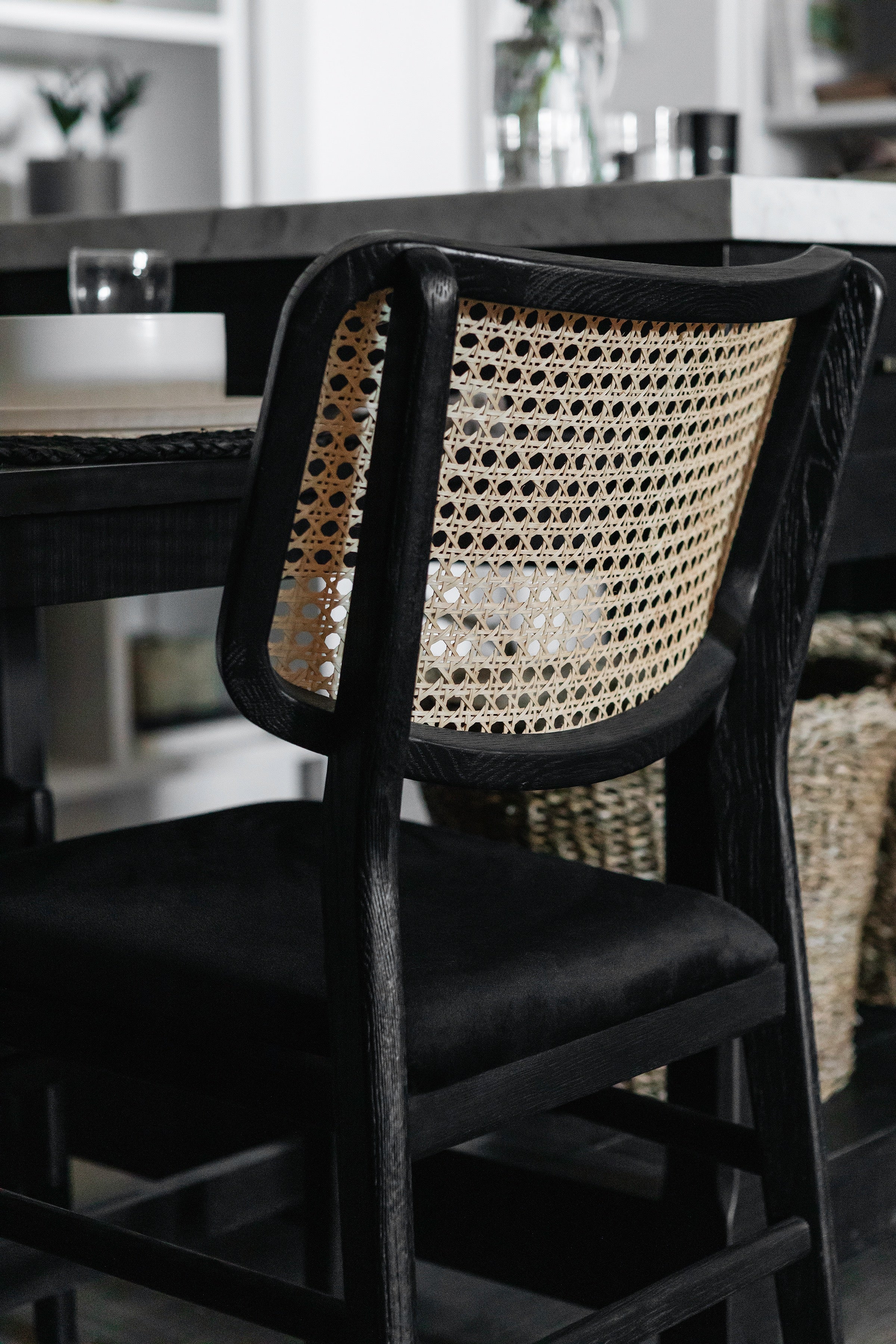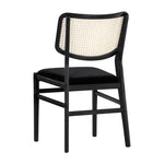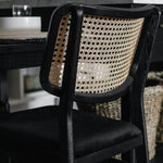 This stylish dining chair will bring life to any living, lounge, office and dining space. Features a beautiful black velvet seat with a natural rattan seatback. A solid black oak wood frame complete this naturally edgy design.