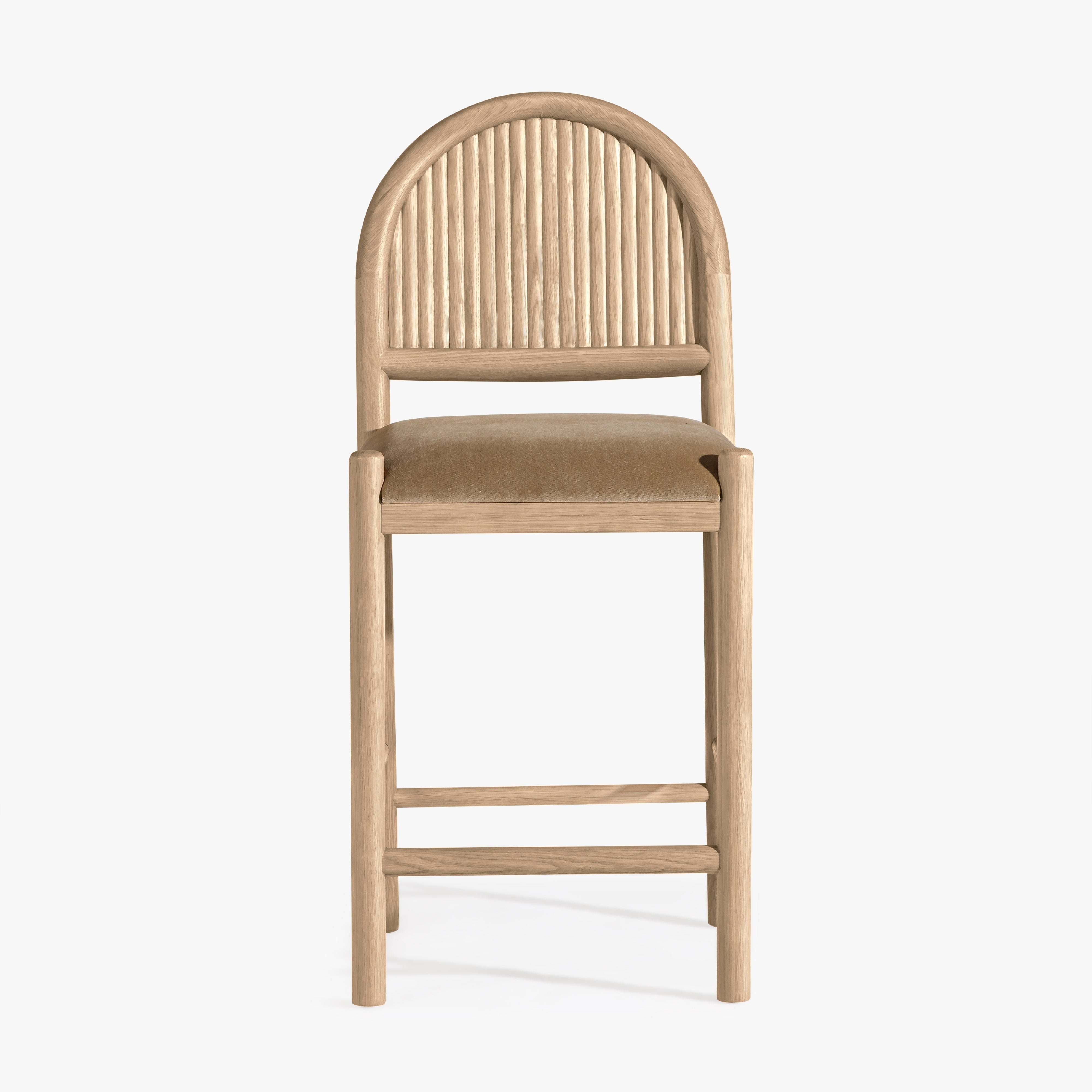The Jones arched counter stool features a reeded back for texture and elegance, complemented by a velvet seat for comfort and style.