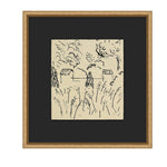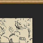 Simple black lines and a vague village sketch adds mystery and modernity to a warm brown canvas and textured gold frame.
