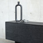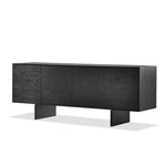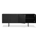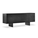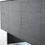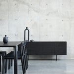 The BLOCK sideboard is crafted from high-quality teak wood, featuring a stylish black soot finish that adds a contemporary touch to any space. Its minimal black powder-coated steel base not only provides stability but also complements the elegant design, making it a sleek and functional storage solution for modern interiors.