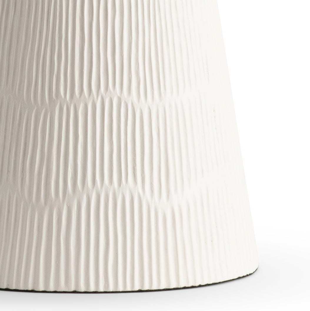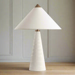 Make a cool geometric statement with the Corelli Table Lamp. This conversation starter goes bold with eye-catching shapes, from the tall tapered base to the conical lampshade. Corelli is crafted from resin, carved with a fine linear texture and finished in matte off-white. Antique brass accents complete the luxe aesthetic.