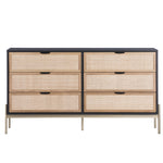 A beautiful black oak dresser with natural rattan features. Gold iron feet and matte black steel handles complete the design.