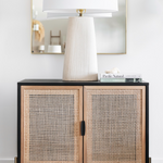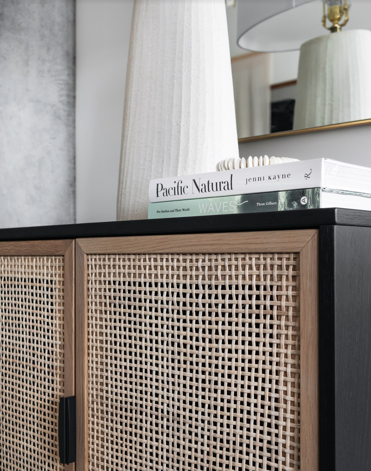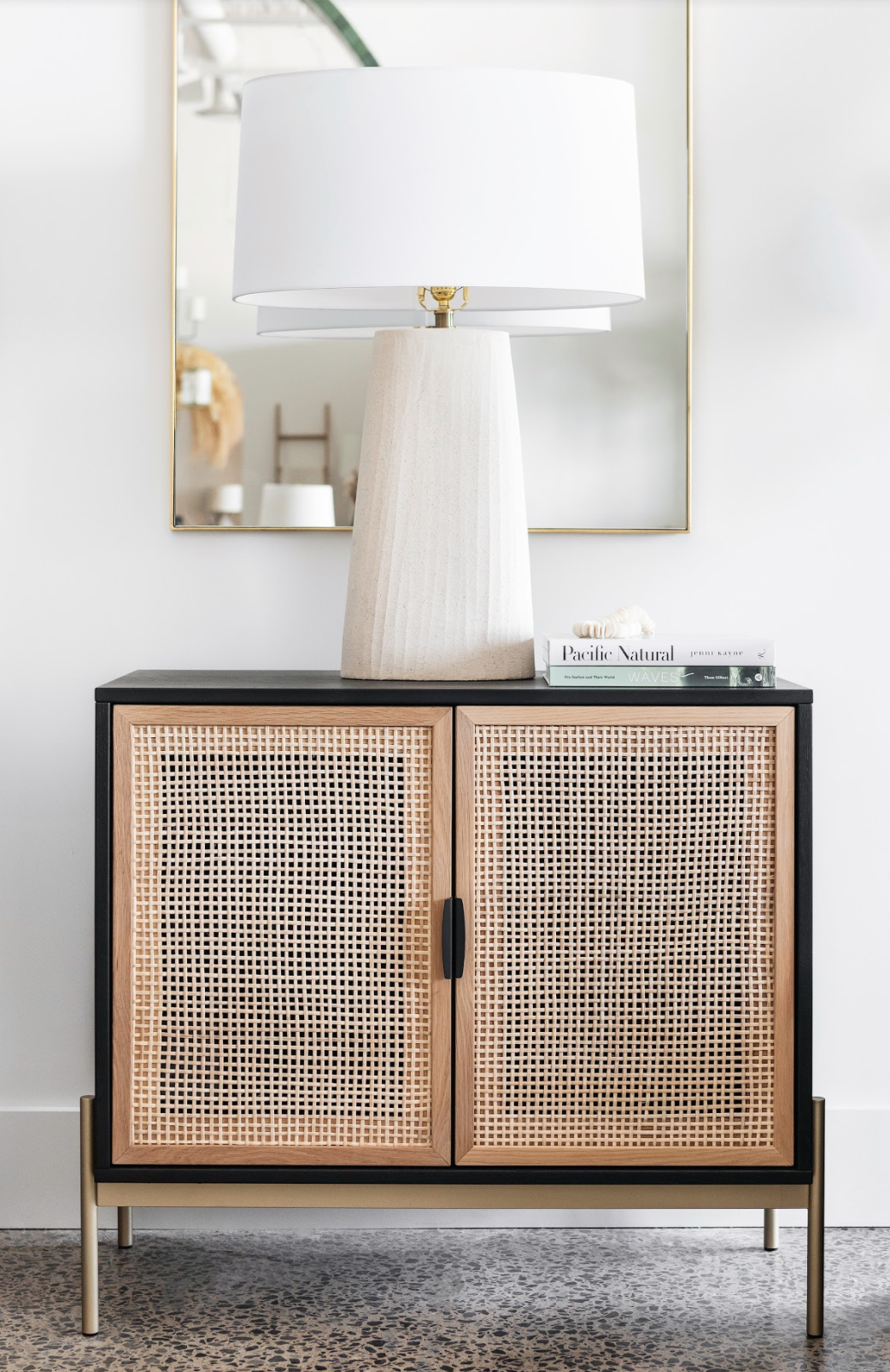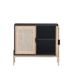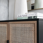 A beautiful solid black oak sideboard with natural rattan features. Gold iron feet and matte black steel handles complete the design.
