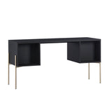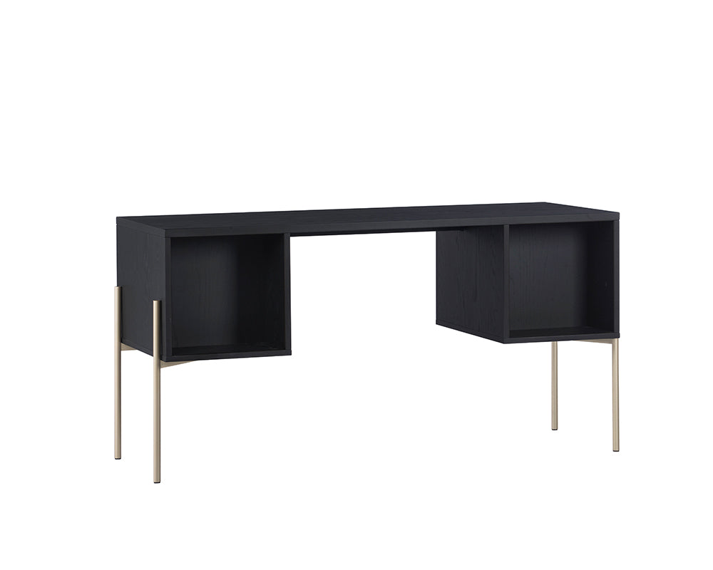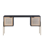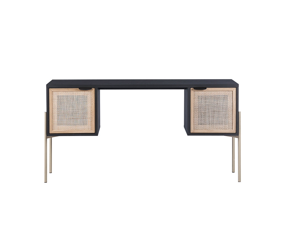 A beautiful black oak desk with natural rattan features and gold iron legs that will help encourage your workflow.
