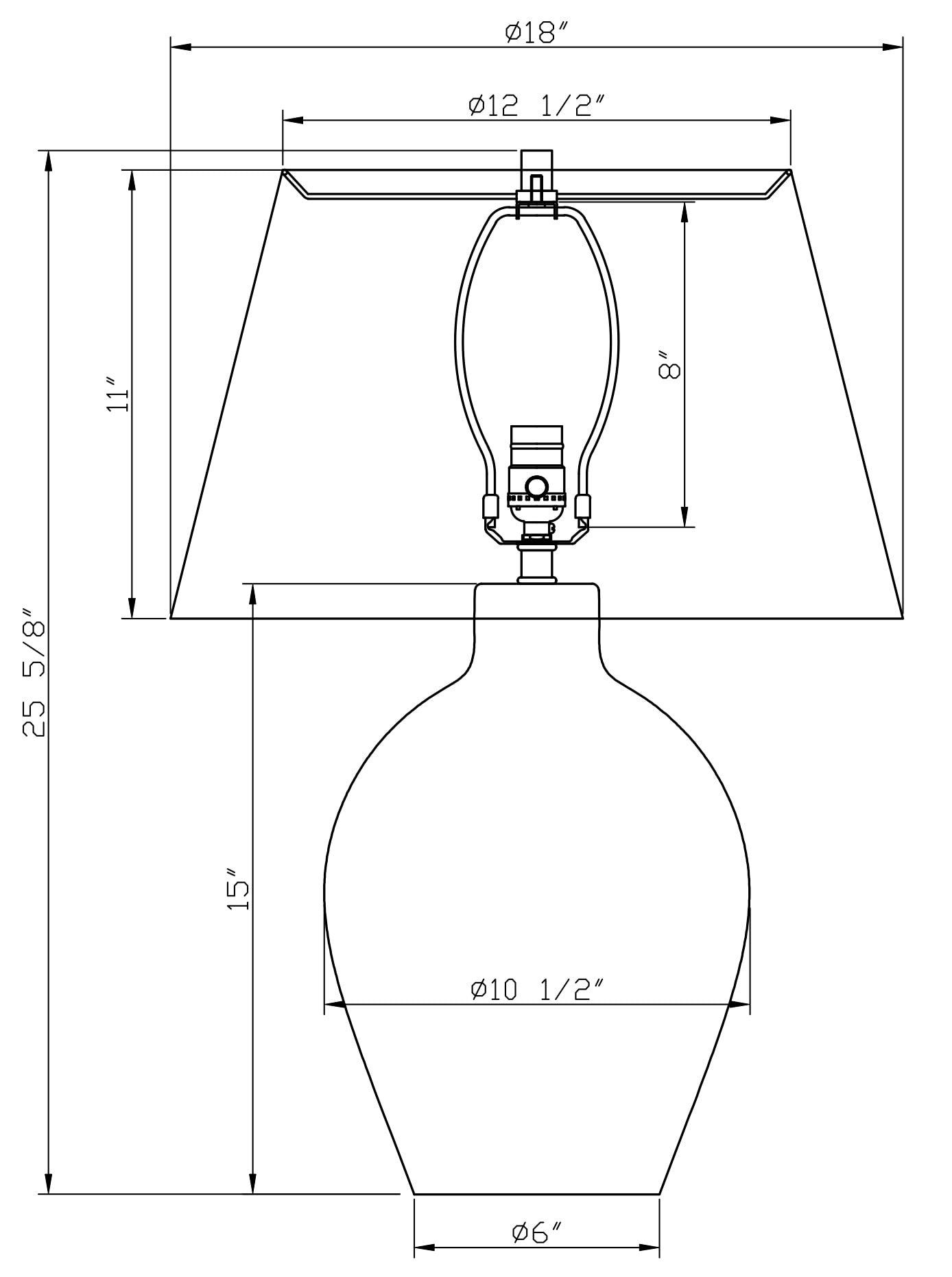 Dimensions: 10.5" W, 25.625″H; Shade:  12.5″ø(t) x 18″ø(b) x 11″H