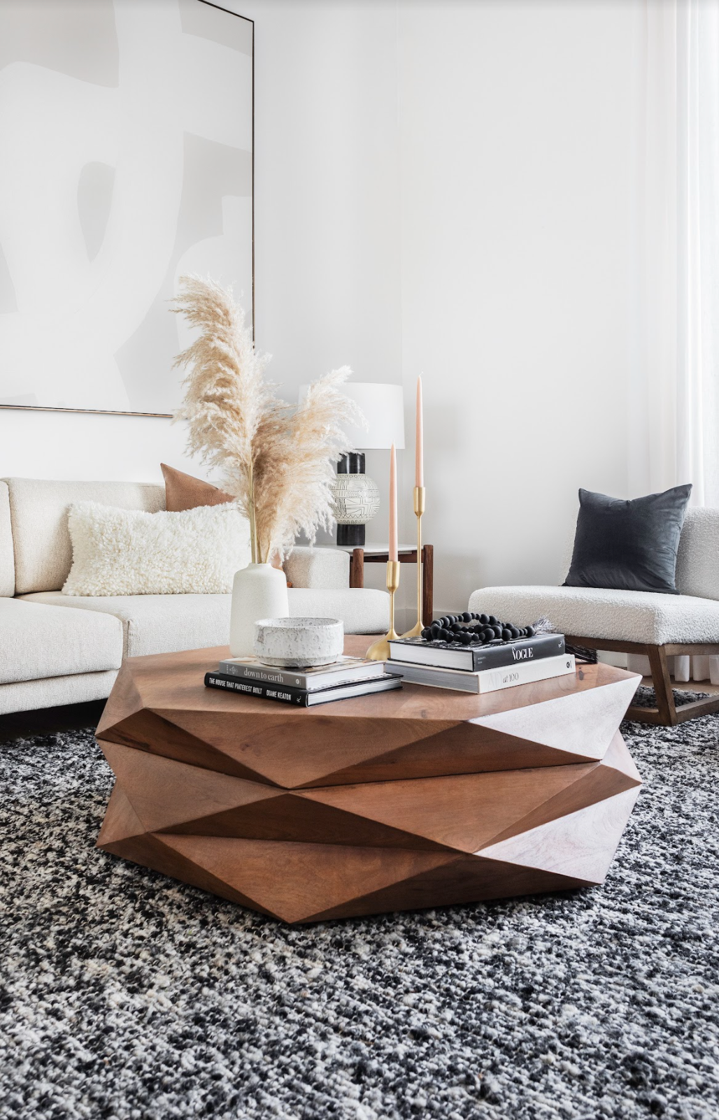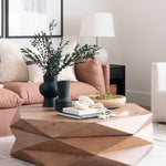 Finished in a medium brown stain, the Felix is a stunning coffee table that is shaped like a hexagon. It features a geometrically appealing, contoured base that adds to the visuals. In addition to being visually interesting, the Felix can also be termed extremely functional, thanks to the hinged top with storage underneath.