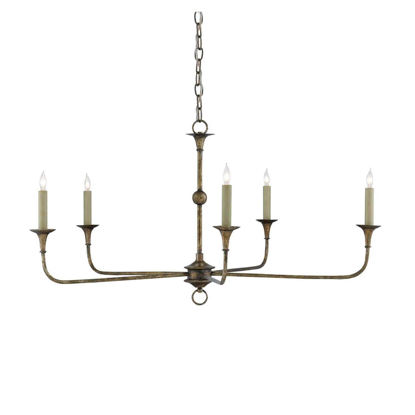 The arms of the Florance chandelier stretch gracefully from a small cog ornamented with a ring that rests at the bottom of its stem. Though it is a seriously minimalist fixture, the profile of the five-light chandelier has a lovely fluidity to it that makes it a natural choice for traditional and transitional interiors.