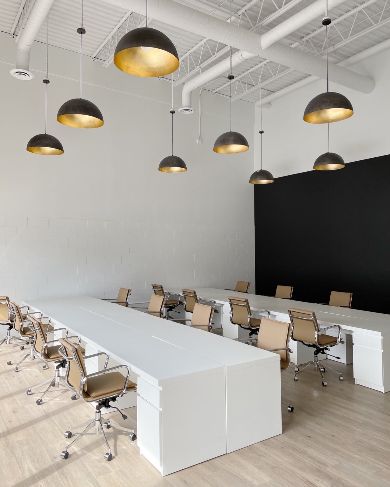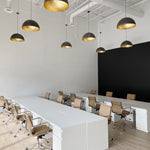 A simple dome shade brings sleek minimalism to the mix. Featuring a gold-leafed finish on the shade’s interior, this gives the room a warm glow and a sophisticated pop of contrast.