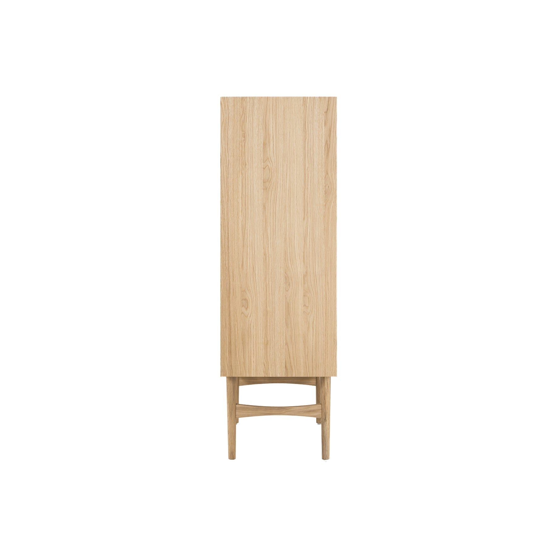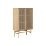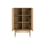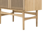 The Higgins cabinet is a fresh take on classic mid-century modern design. A solid, FSC certified Oak case is supported by a turned wood leg frame with sculpted crossbars. 2 hinged doors with intricately woven Danish paper cord detailing conceal adjustable shelves.