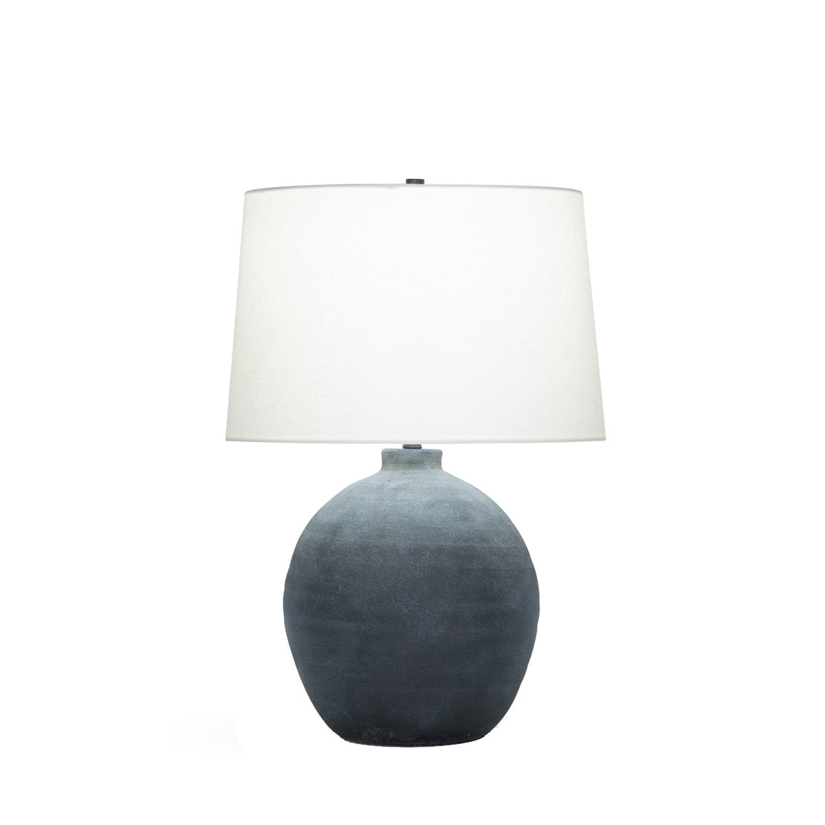 This lamp’s round ceramic body wears a distressed black finish that forms the look of a modern antique. The off-white linen shade creates a classic color combo that fits into many design styles. This lamp’s short stature would be right at home on a desk in an office or even on a buffet in a dining room or living room.