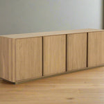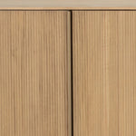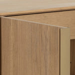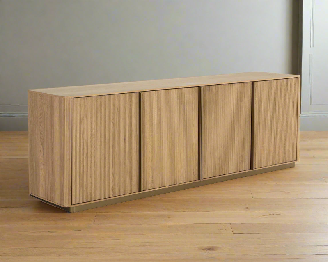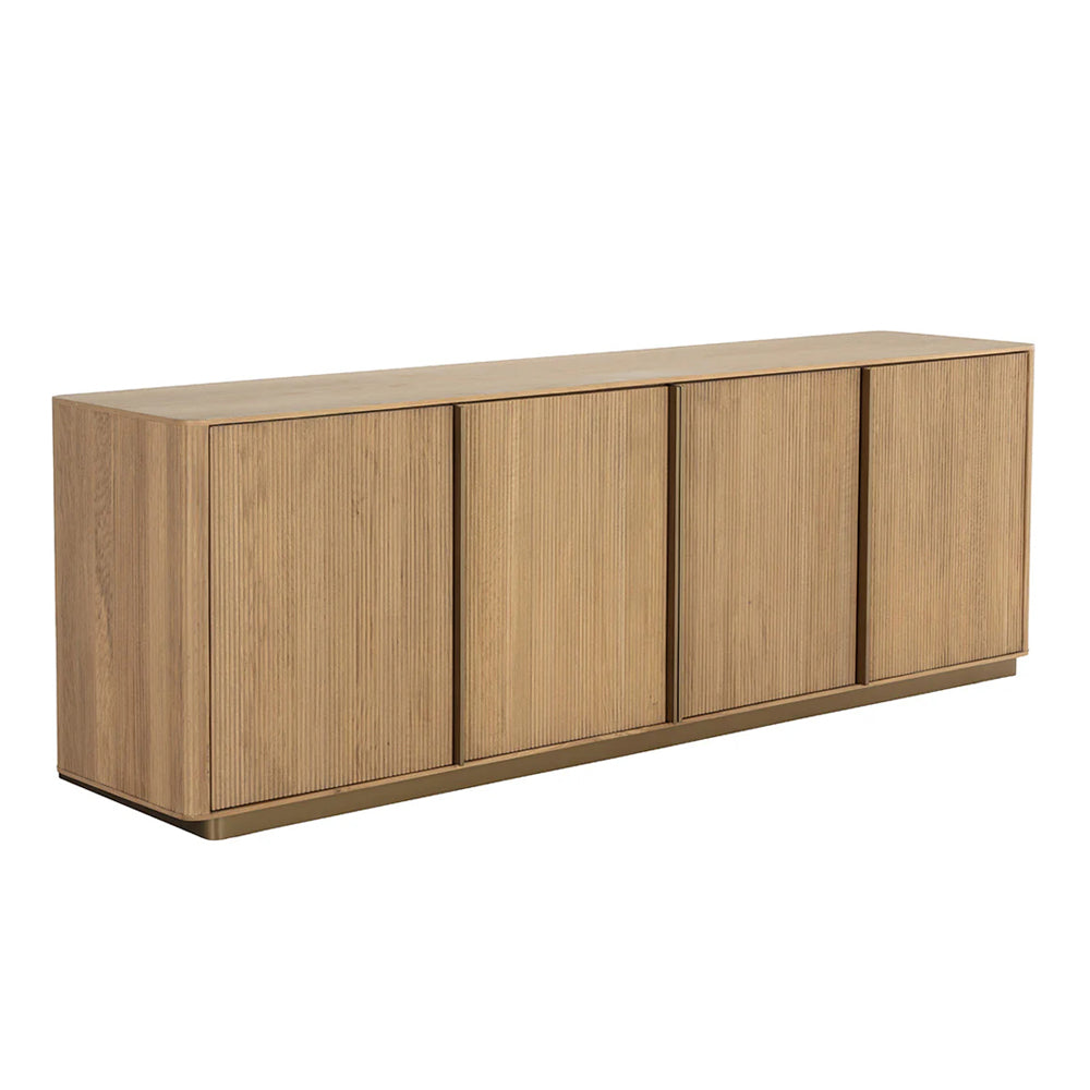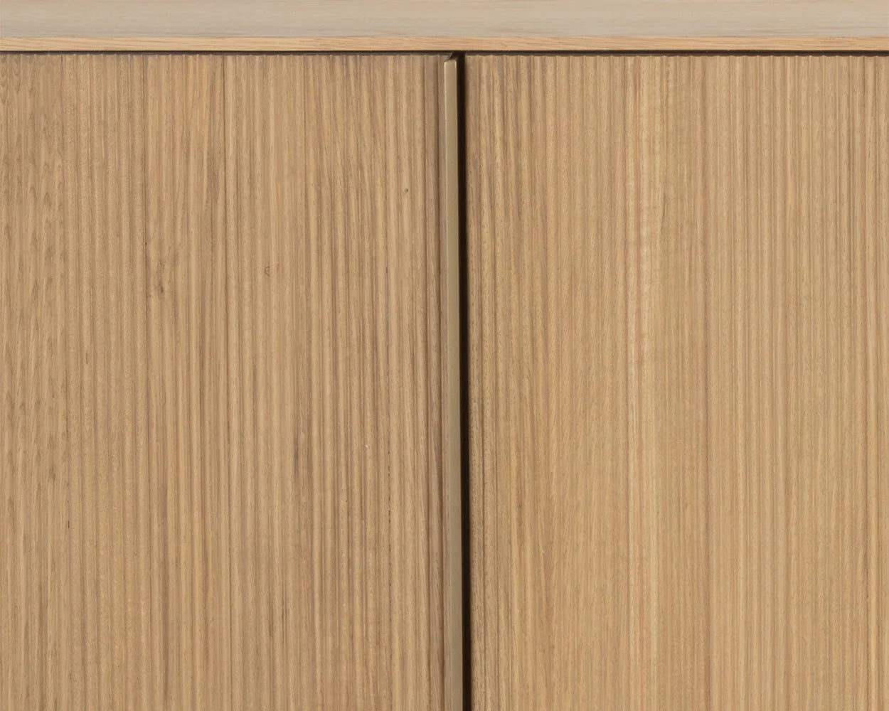 The Kalla Sideboard brings form and function to life. Crafted with a rustic oak veneer with vertical reeding. A gold steel base finishes the look. Featuring added drawers and shelving for ample storage space. As wood is an organic, porous material, these pieces will contain natural variation of texture and may also exhibit fine indentations and cracks. Wood pieces will also display a disparity of colour and grain, and visible knots and burls that add to the character of each piece.