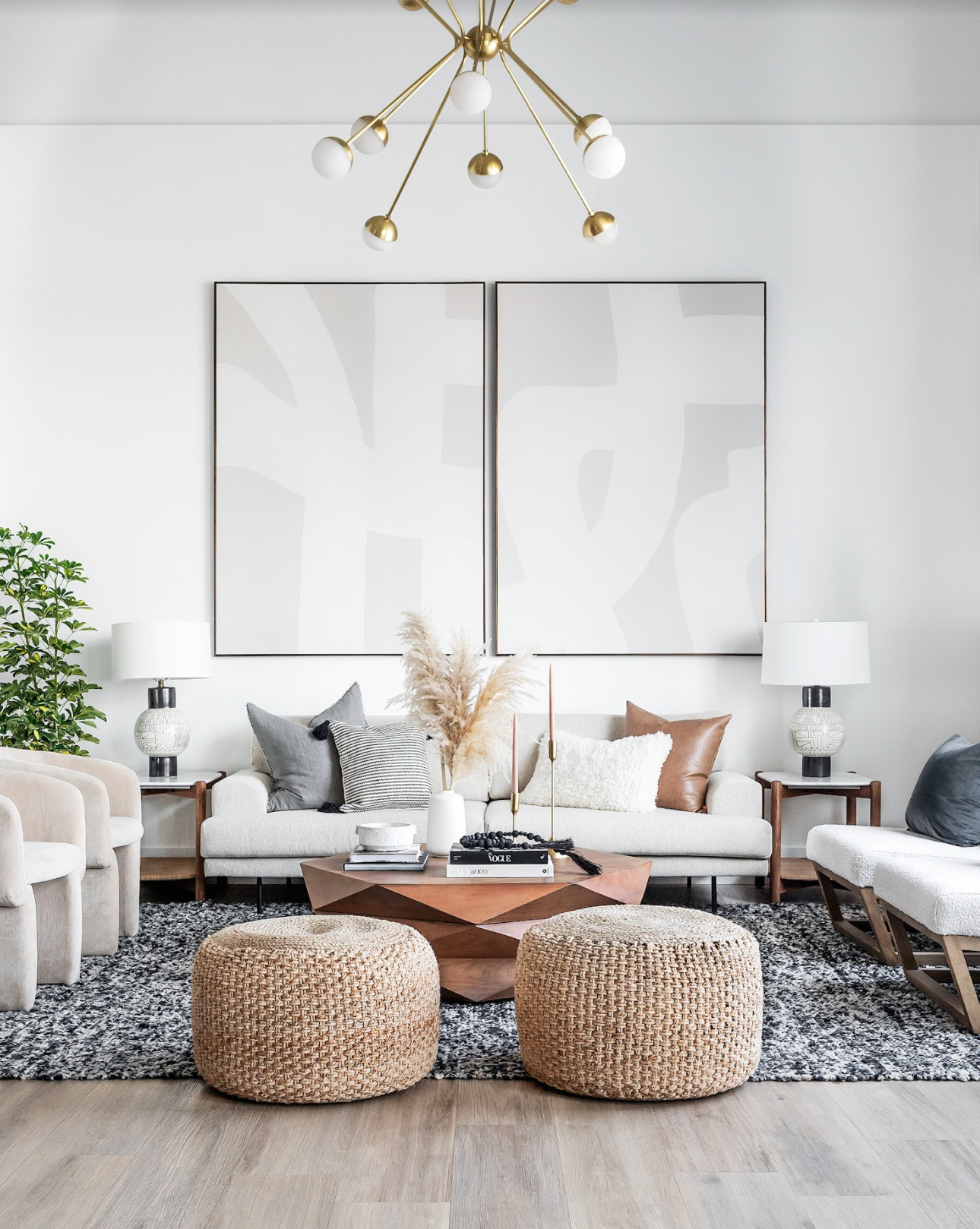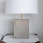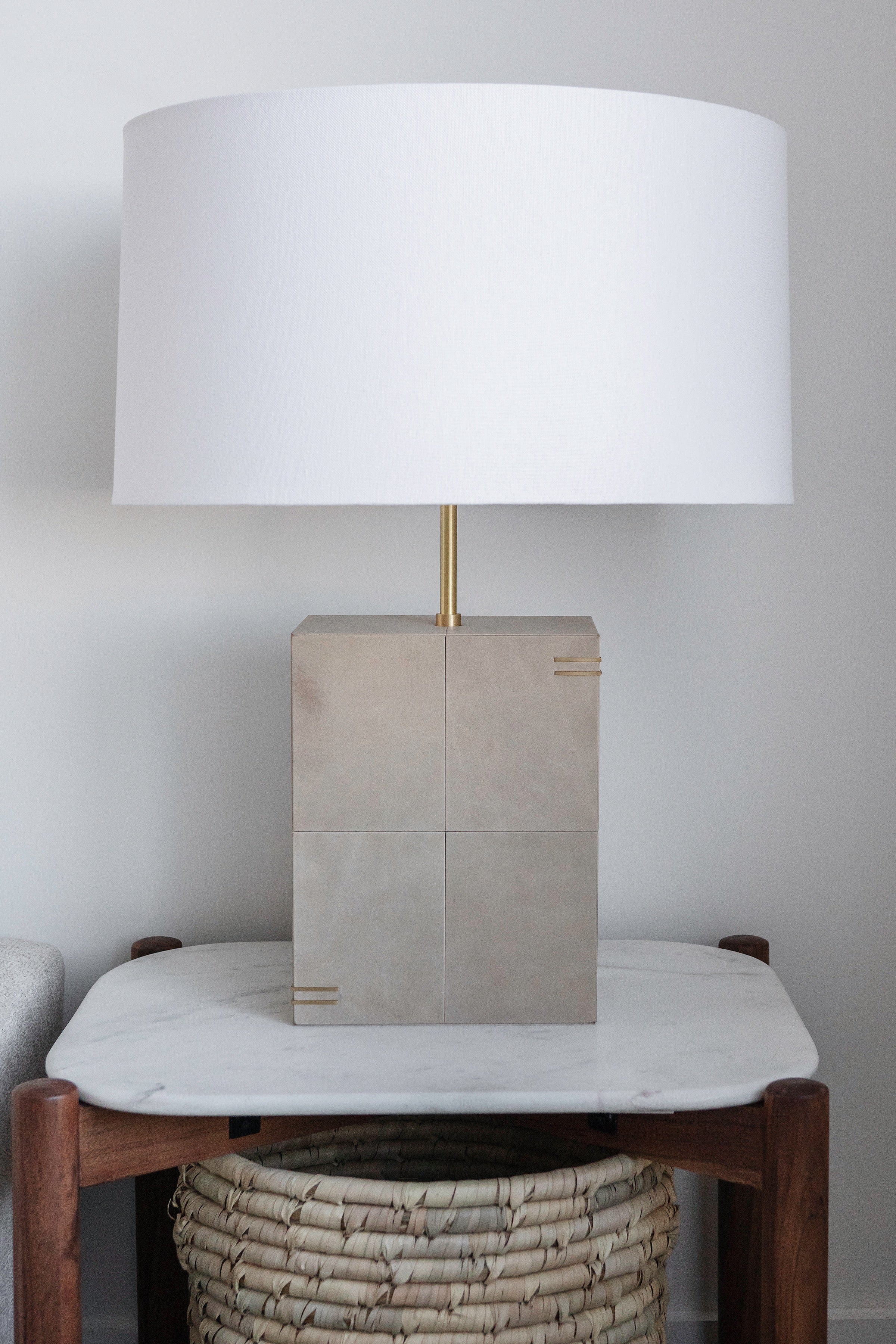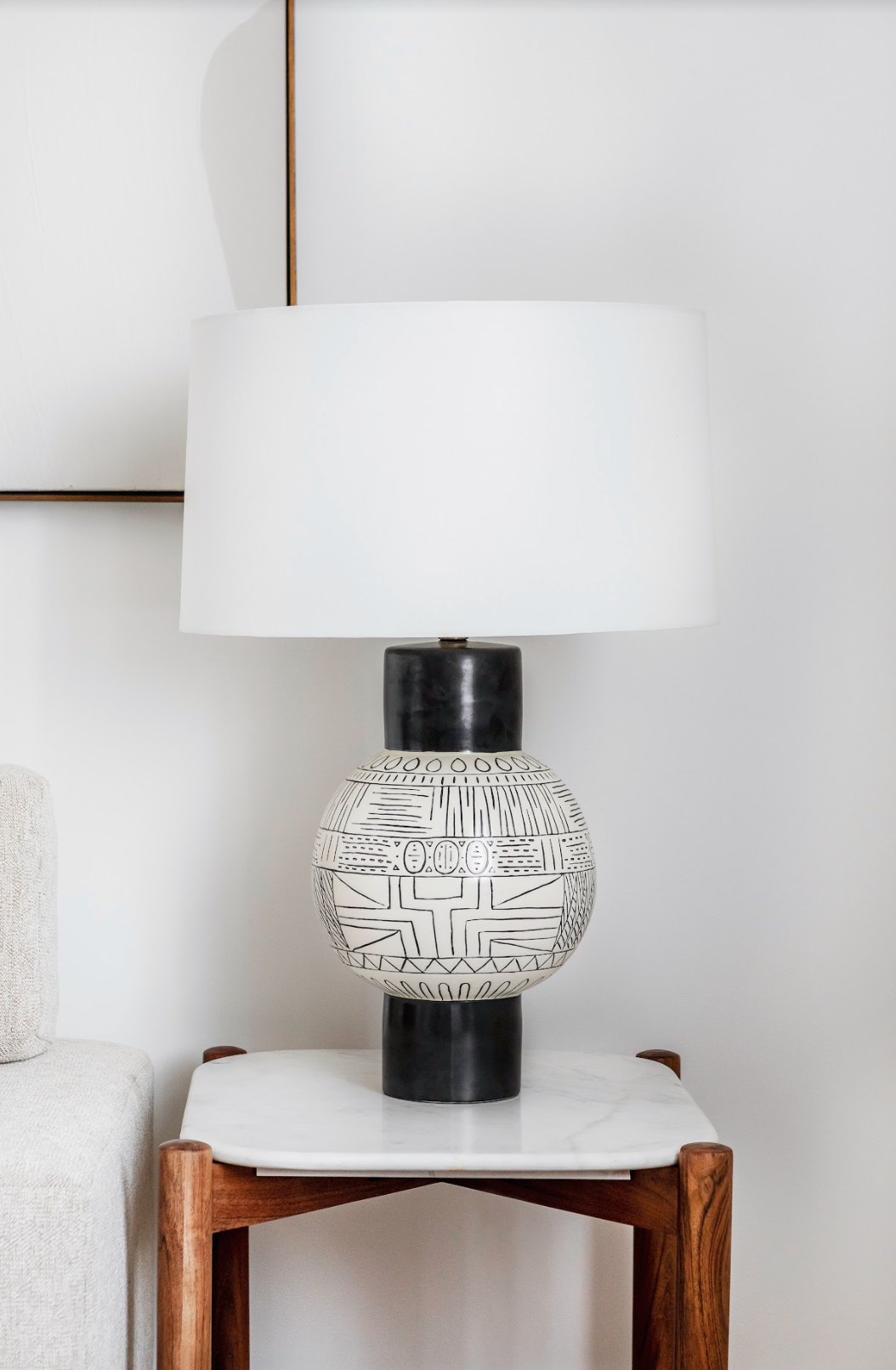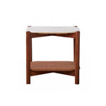 Clean turned posts support a slab of white banswara marble top. A soft edge and wrapped woven cane on the floating shelf helps maintain form and function to this mixed-material table.