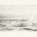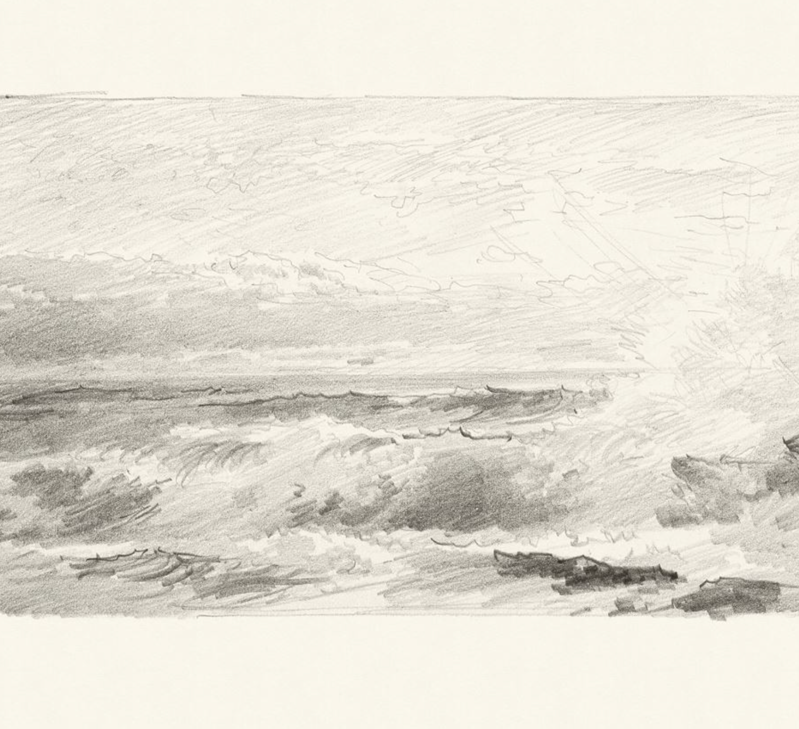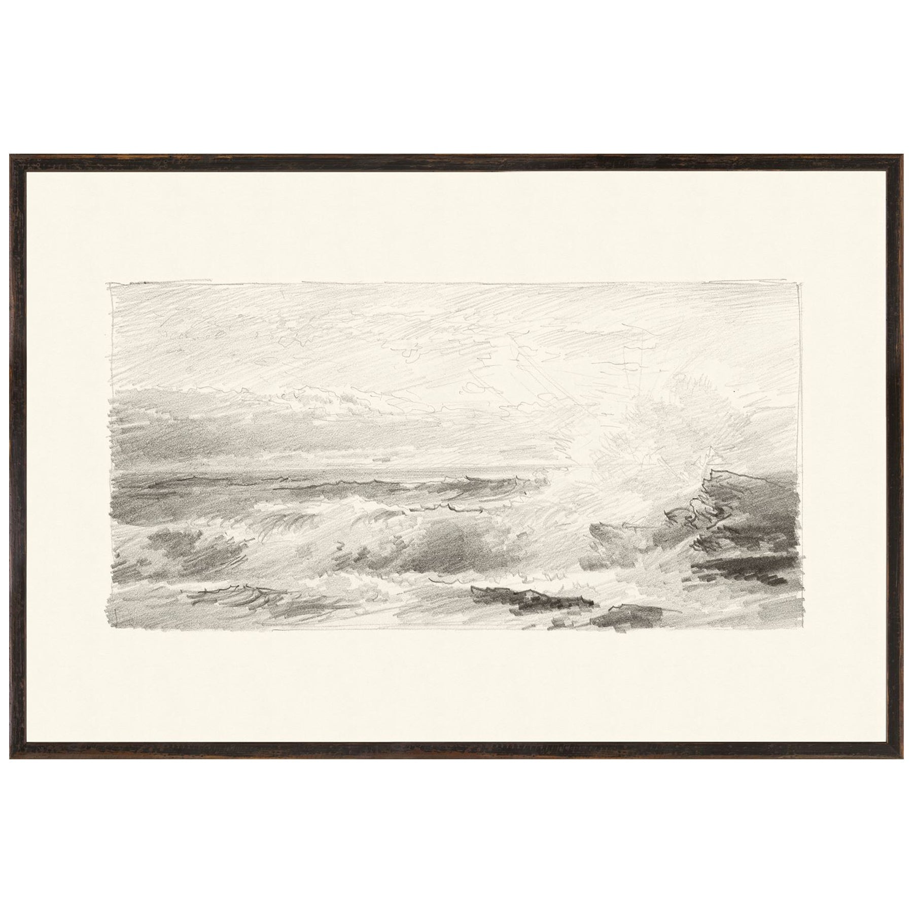 A handsome graphite seascape drawing. Each is framed in distressed dark wood frames for the feel of an authentic family heirloom.