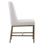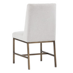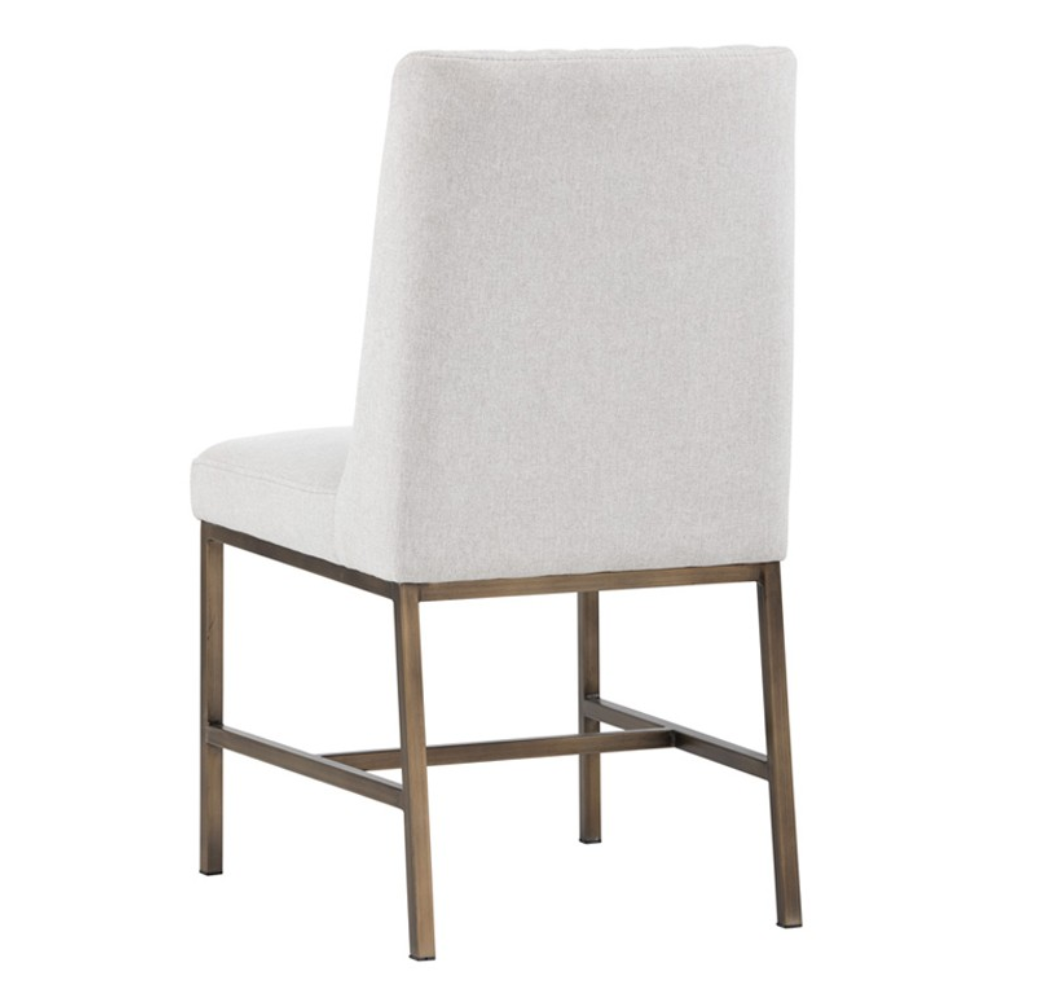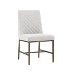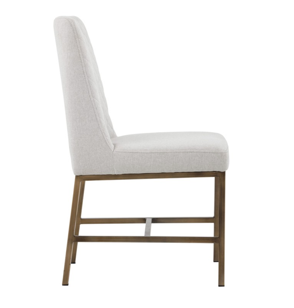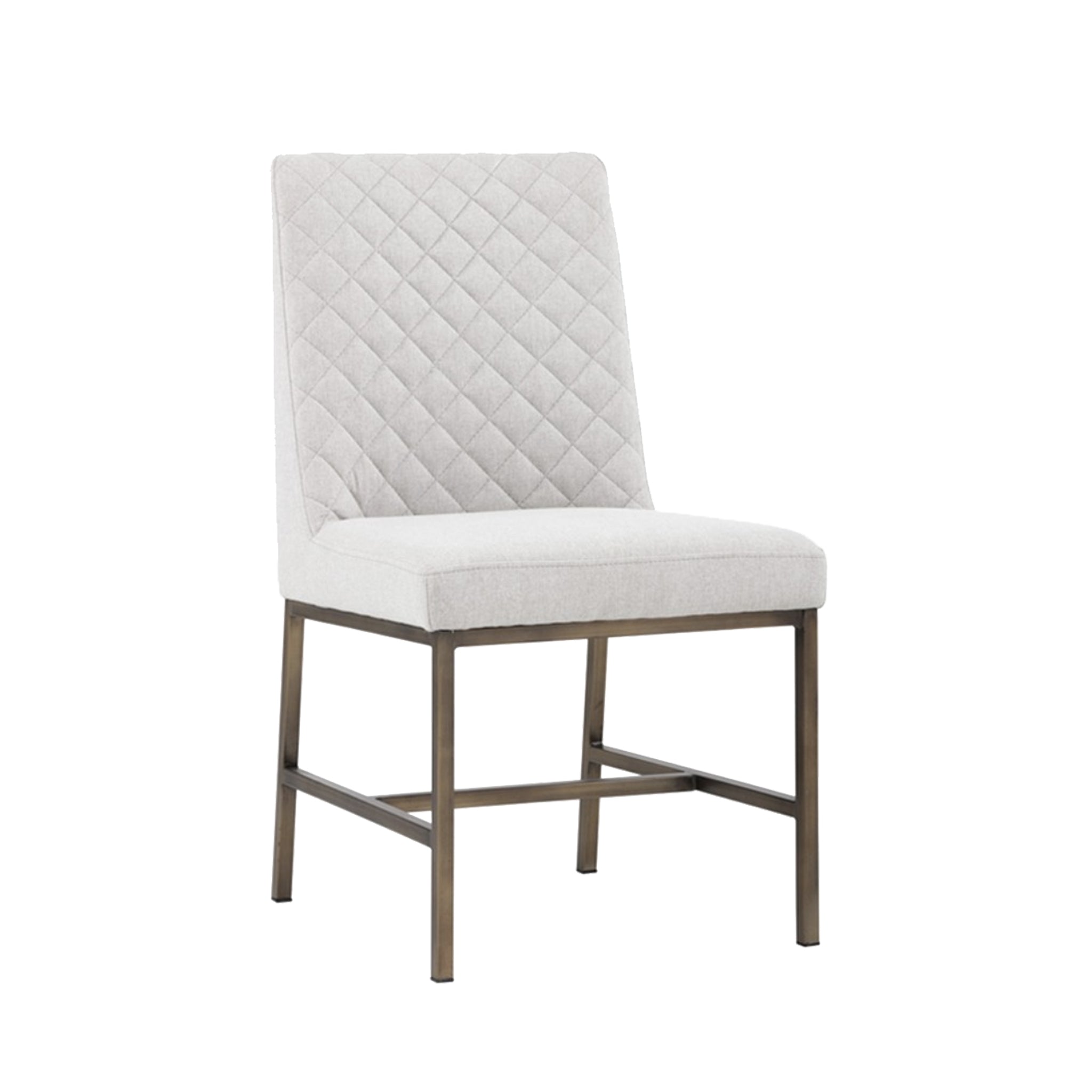 Transform transitional spaces with this dining chair with diamond stitching on the interior seat back and an antique brass steel frame.