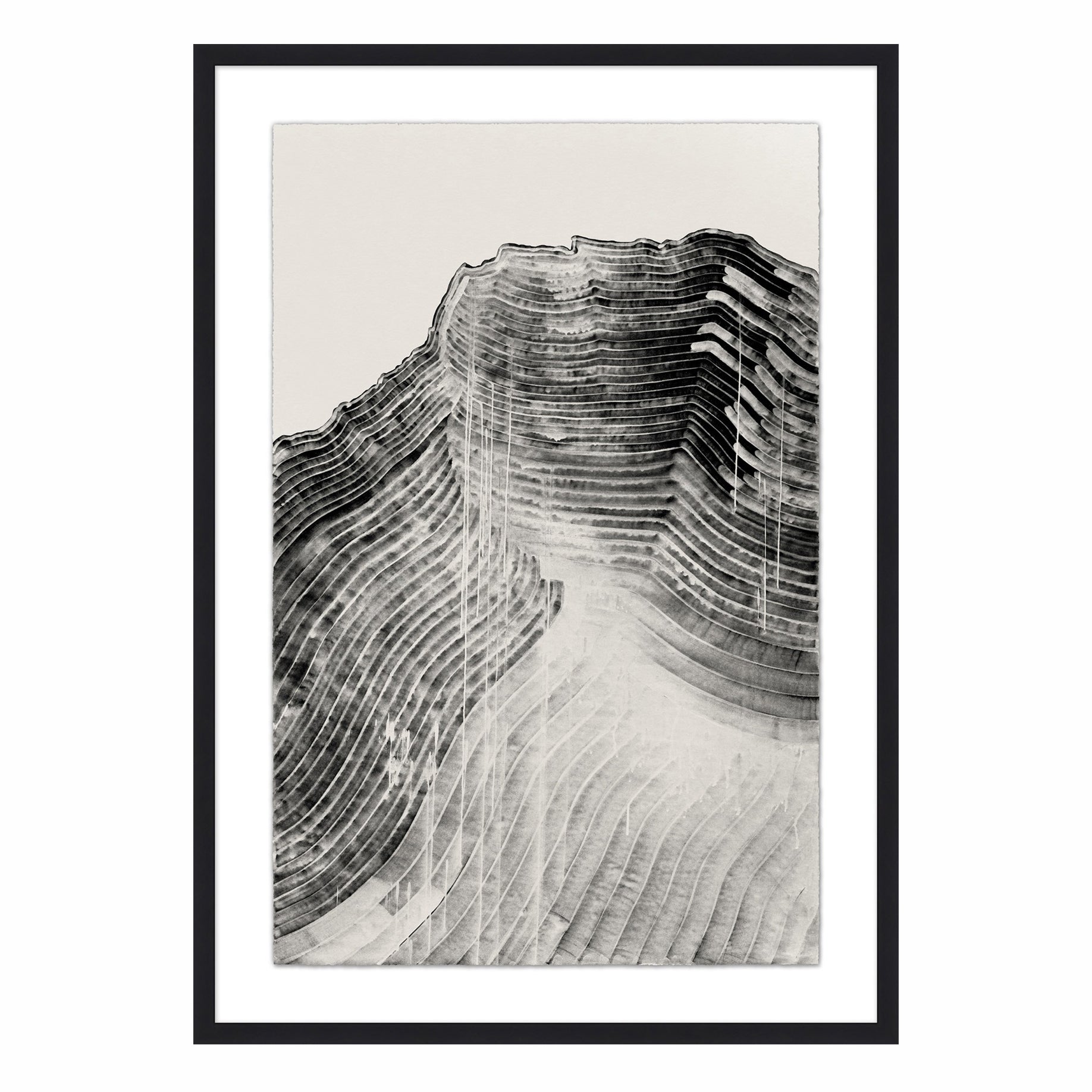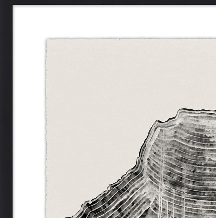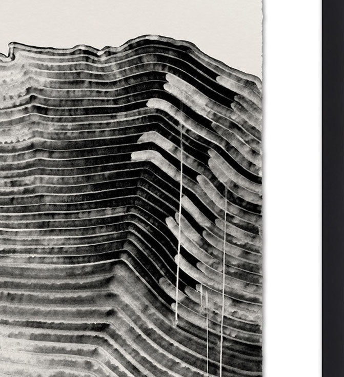 Abstract giclee of a linear range on hand deckled watercolour paper, framed in a shadowbox.