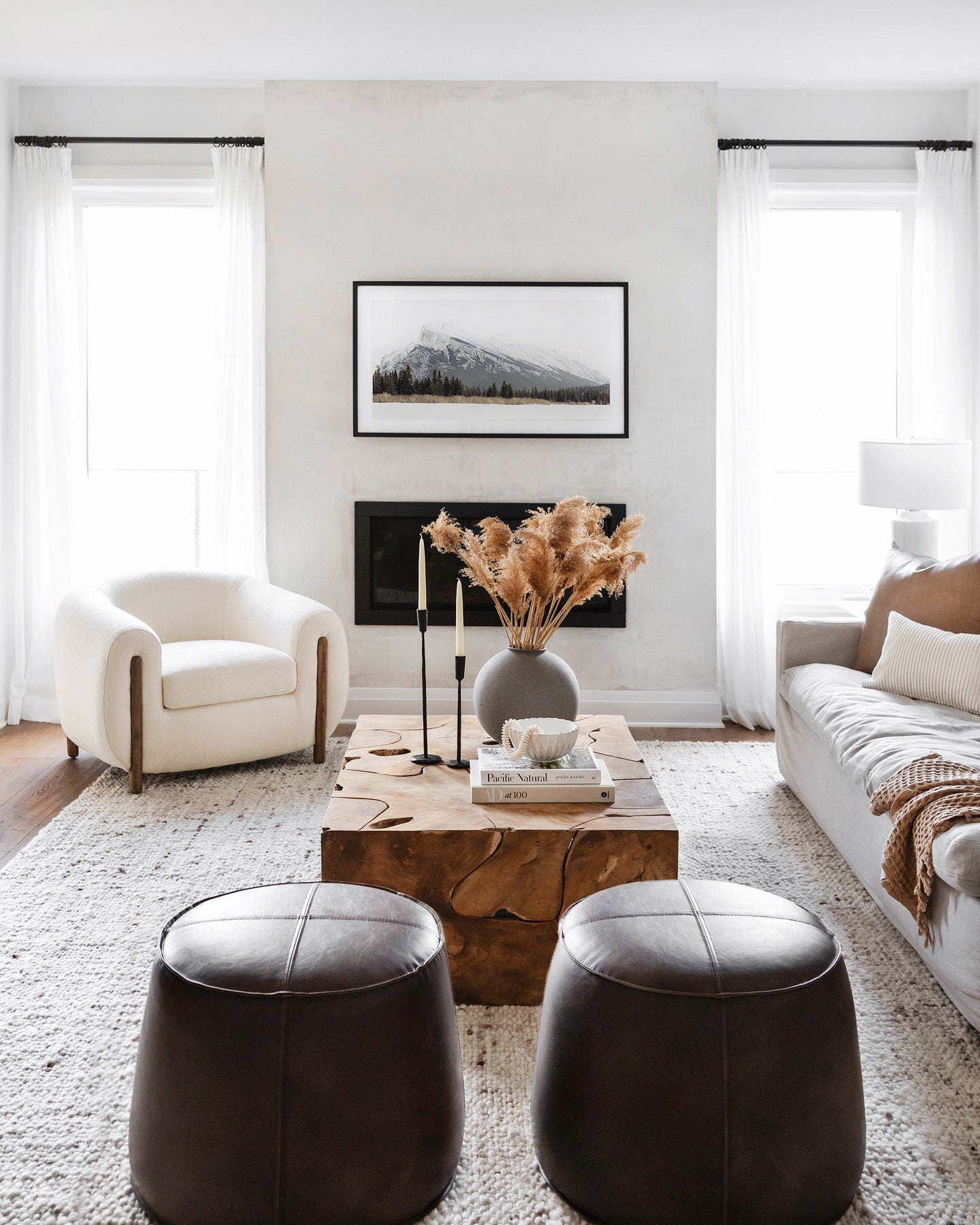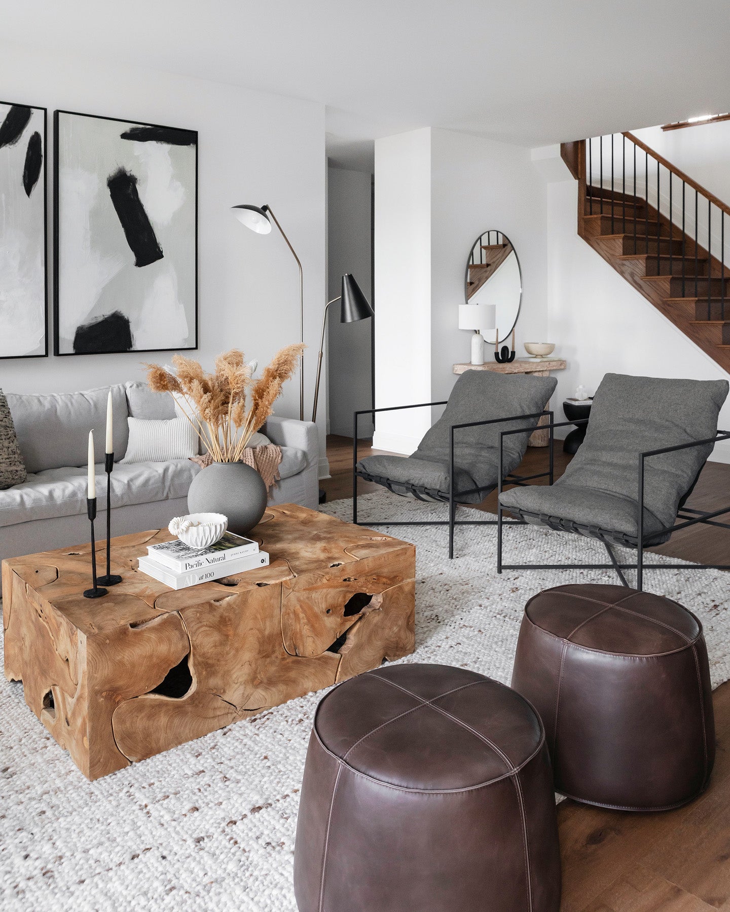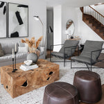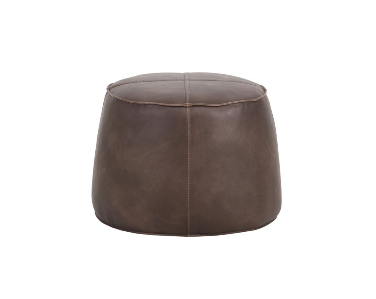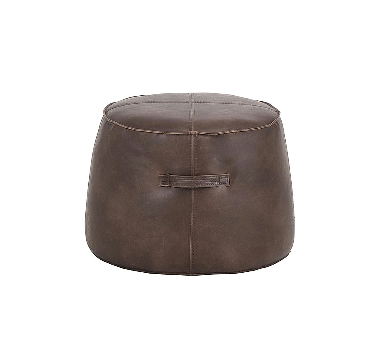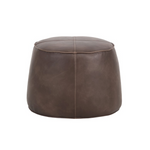 A handsome round ottoman in a vintage-look havana dark brown faux leather. Features a handle and exposed stitching for added function and detail.