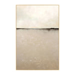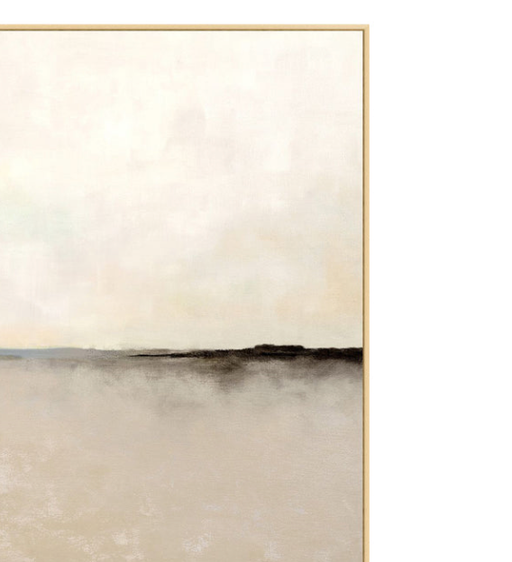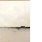 A soft, neutral abstract canvas surrounded by a natural wood frame.