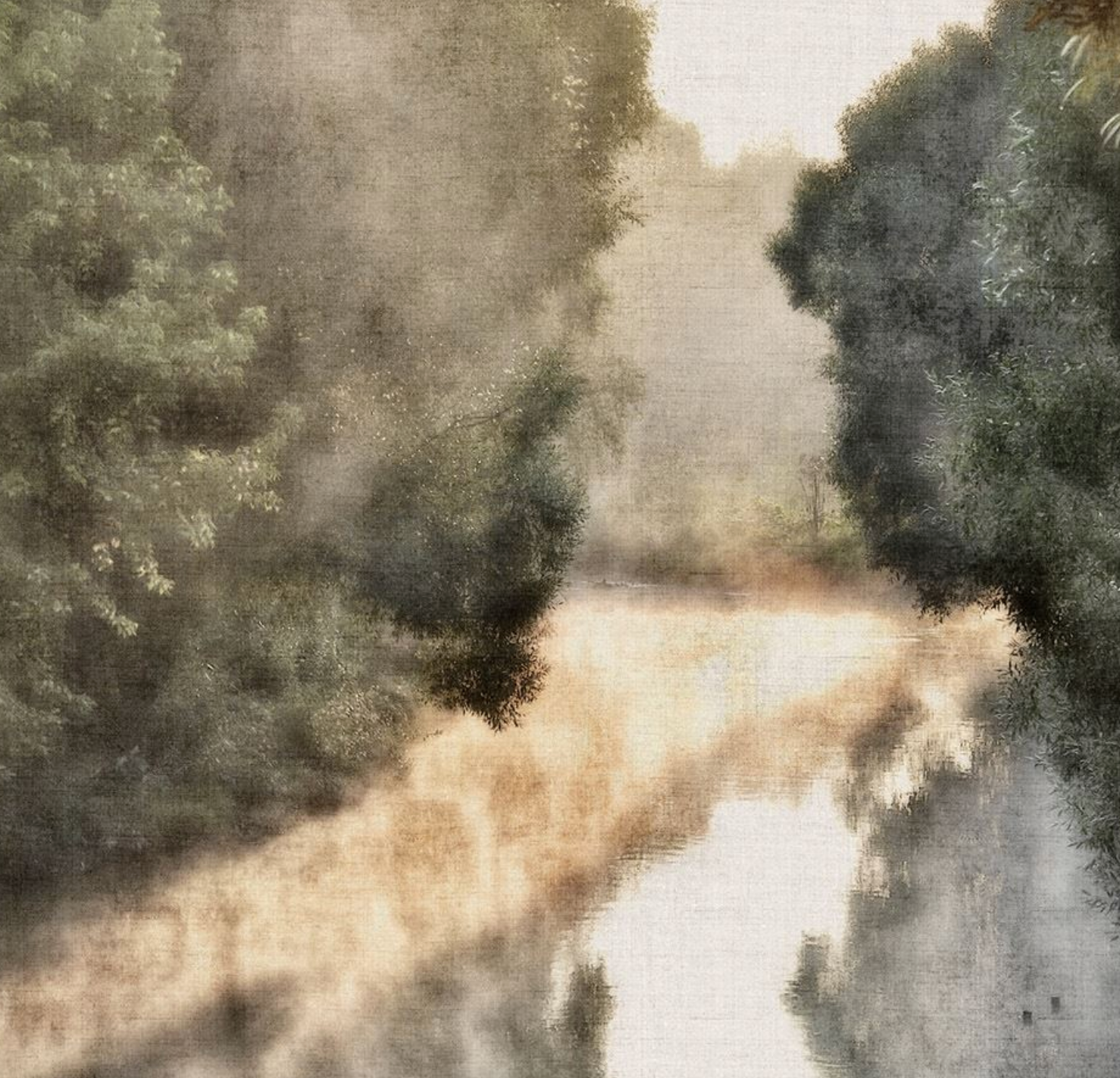 A quiet morning and the sun is burning off the mist above a slow-moving creek. Soft linen texture adds a contemporary vibe to this transitional piece. Here on canvas with grey washed floater frame with antiqued silver face.