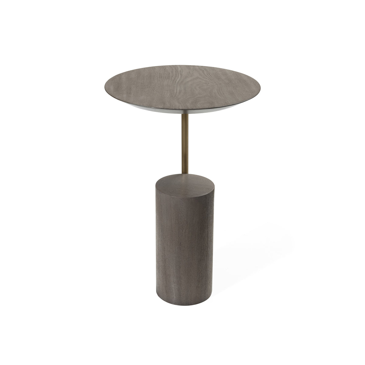 Making an appearance in only the most stylish settings, the petite Nelle round drinks table features a round, reverse bevel top floating above a brushed brass post and sturdy, smokey grey oak cylinder base that beautifully accentuates the natural wood grain. An unforgettable accent table in any space.