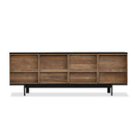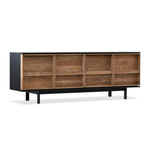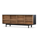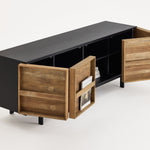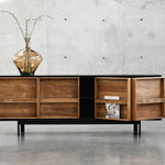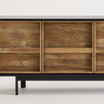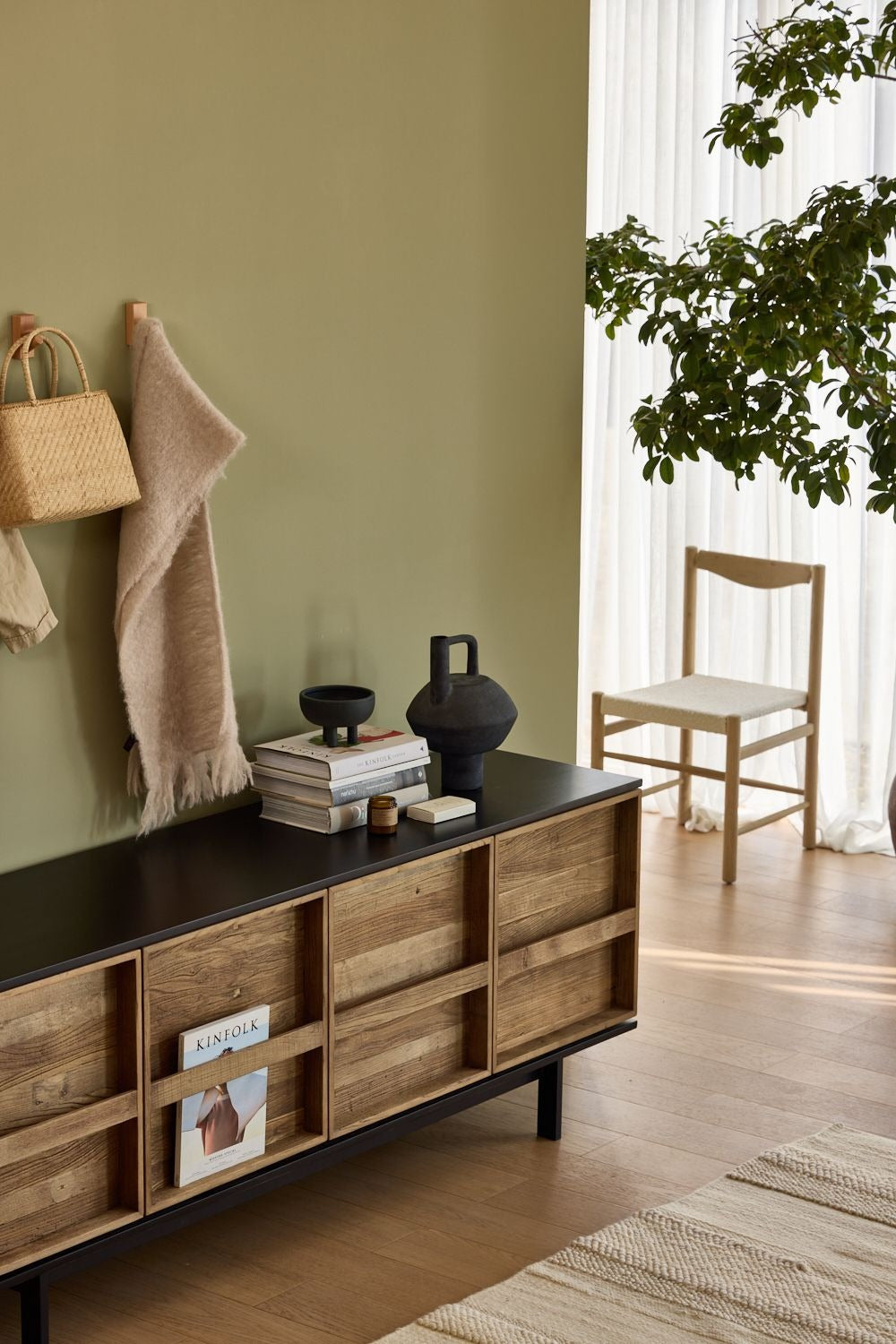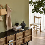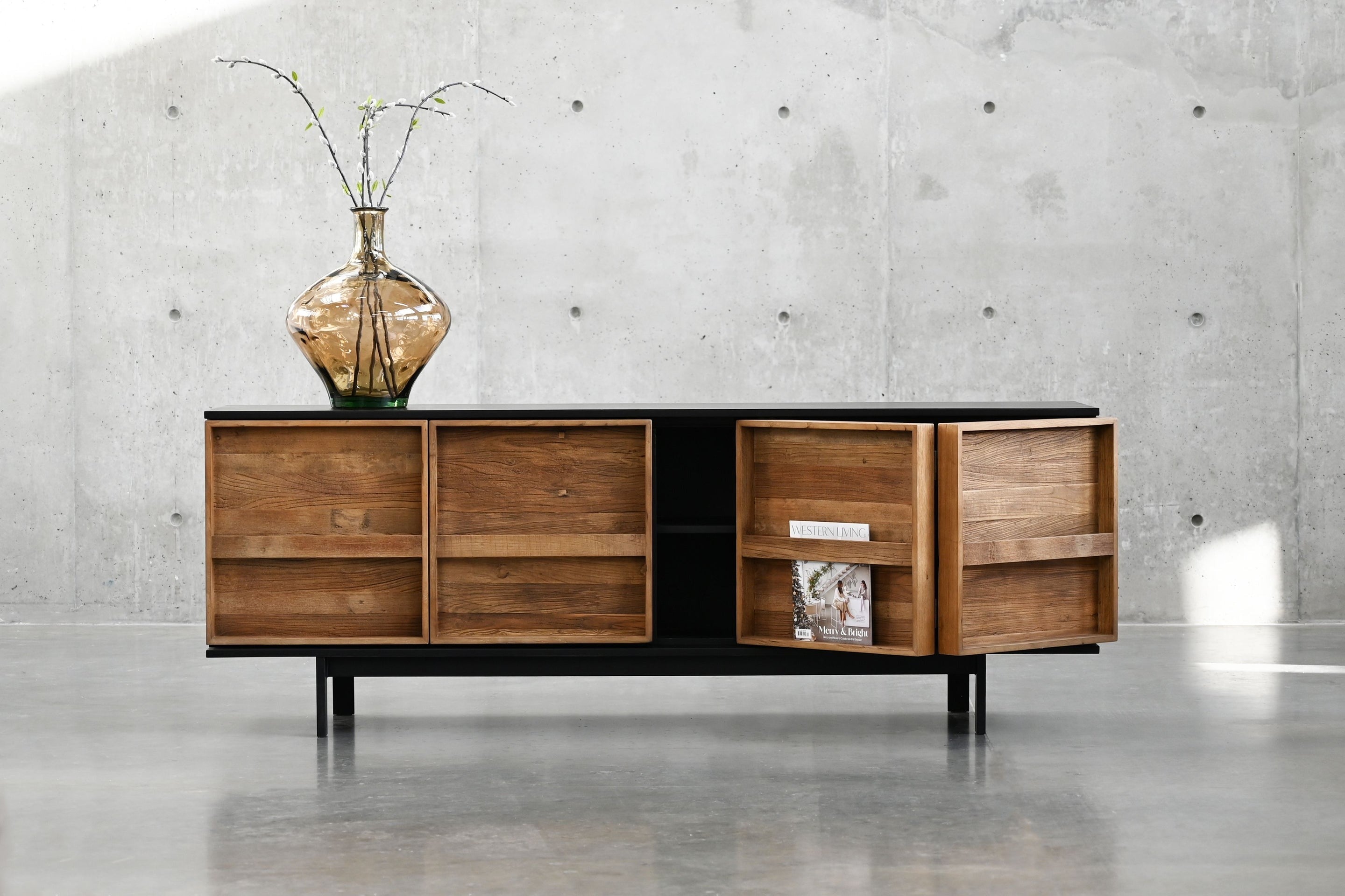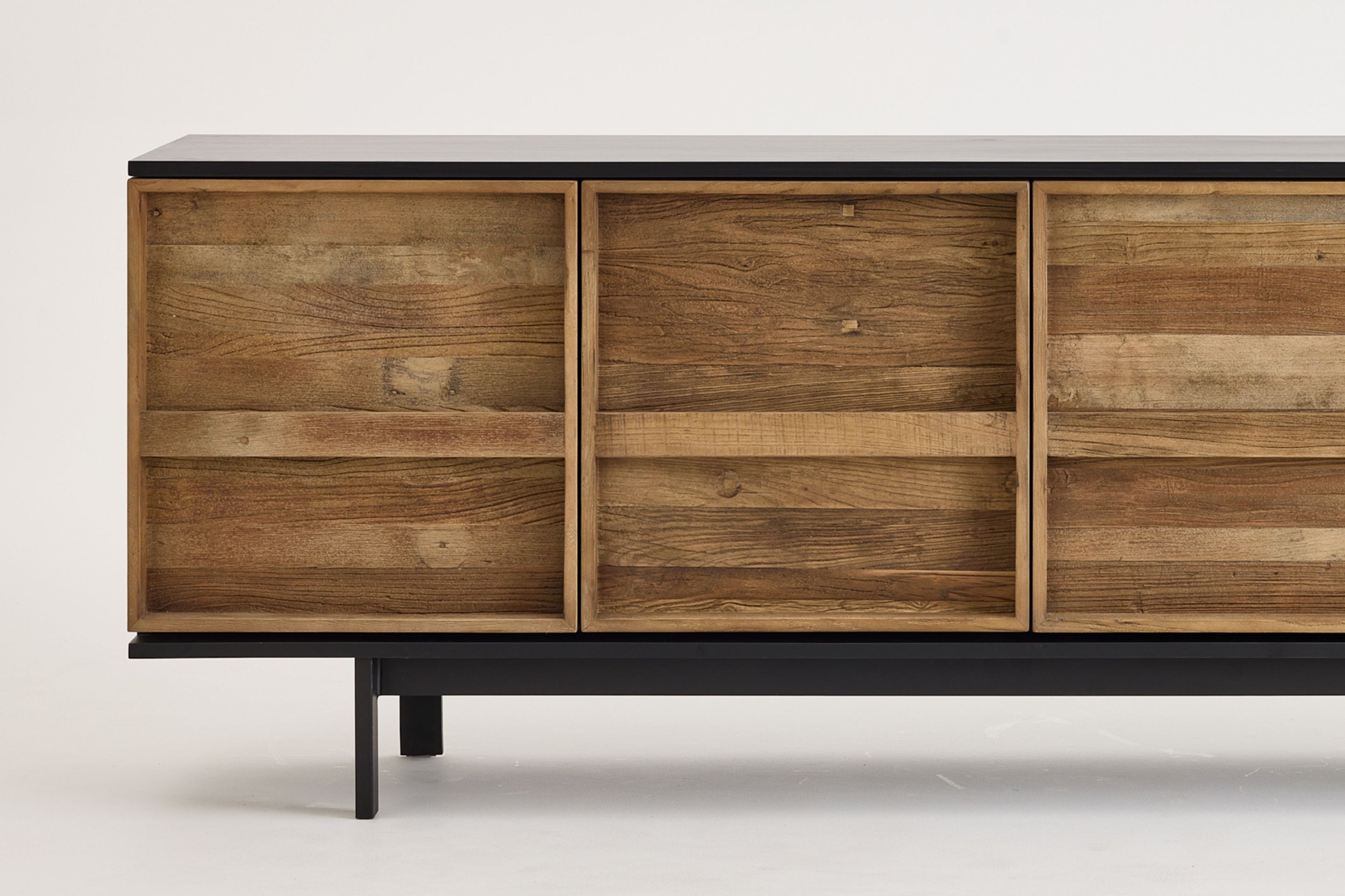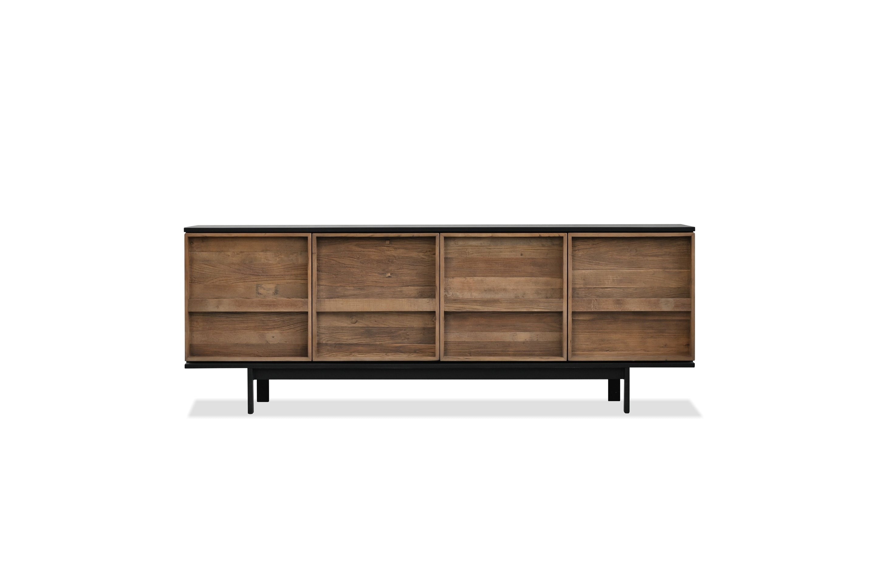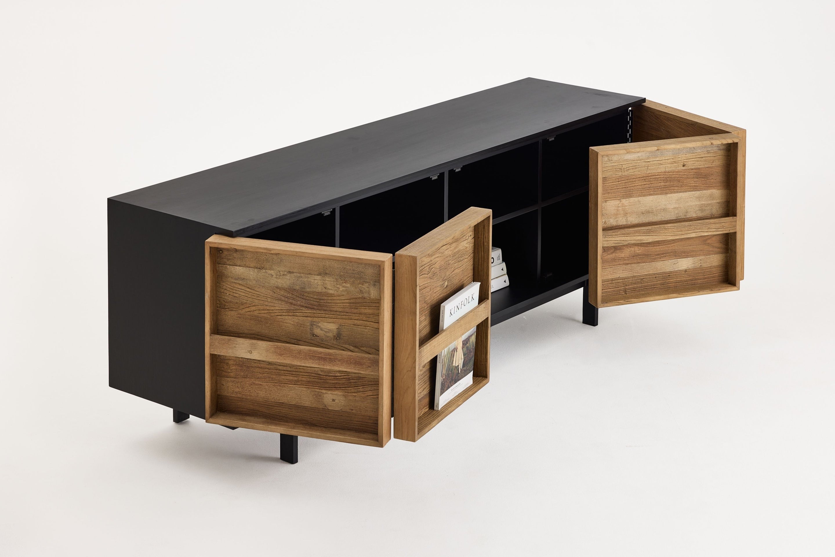 The PASSAGE sideboard combines sustainability with contemporary design, featuring doors crafted from reclaimed elm wood paired with a sleek matte black body and top. Its distinctive accordion-like open and close design adds visual interest, while the eight interior shelves provide ample storage for books or discreetly hiding clutter, making it a practical and stylish addition to any room.