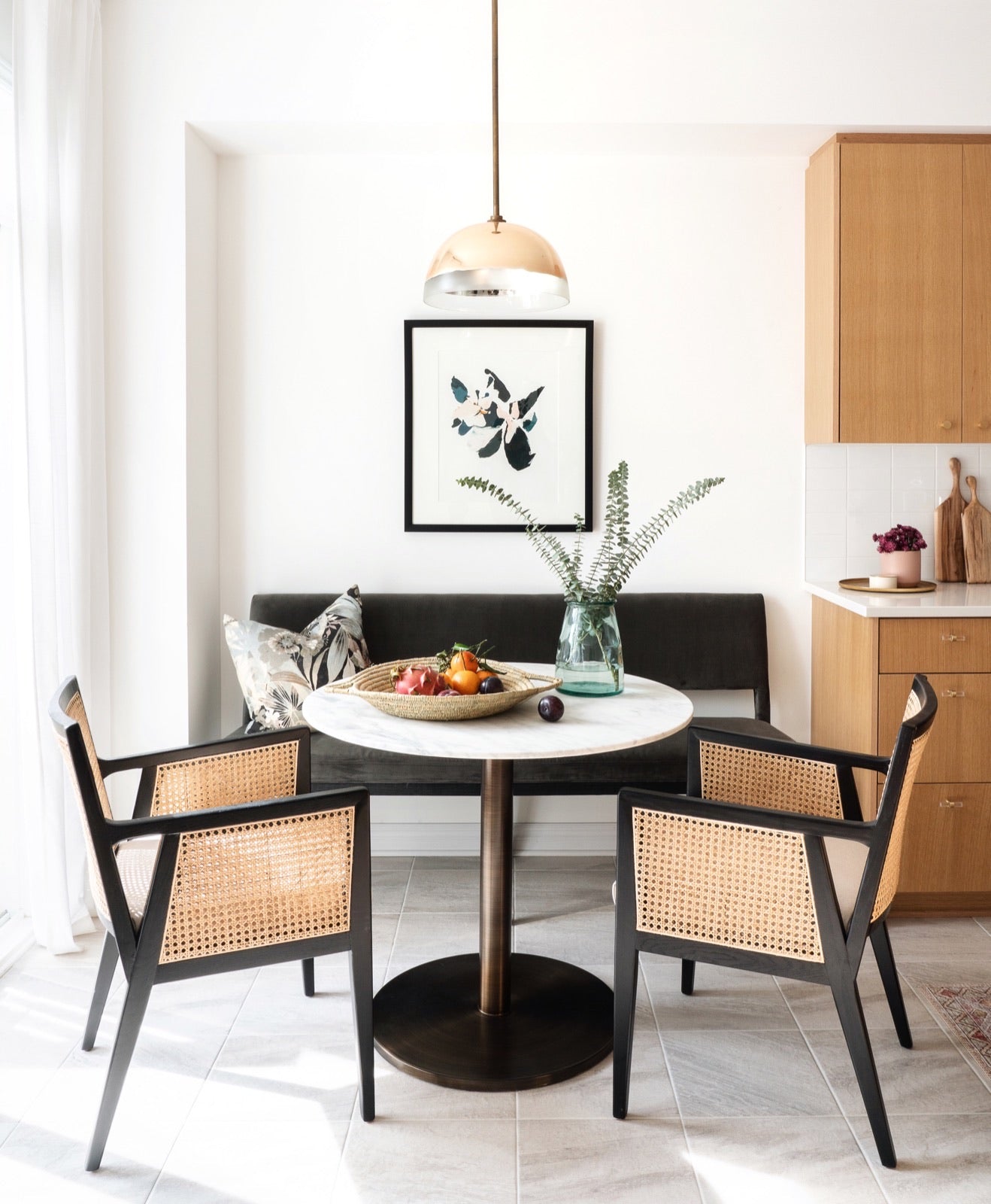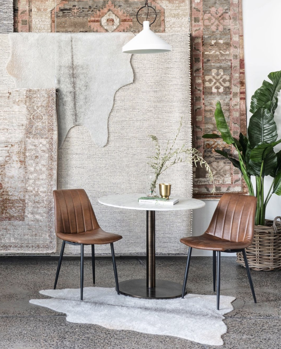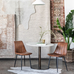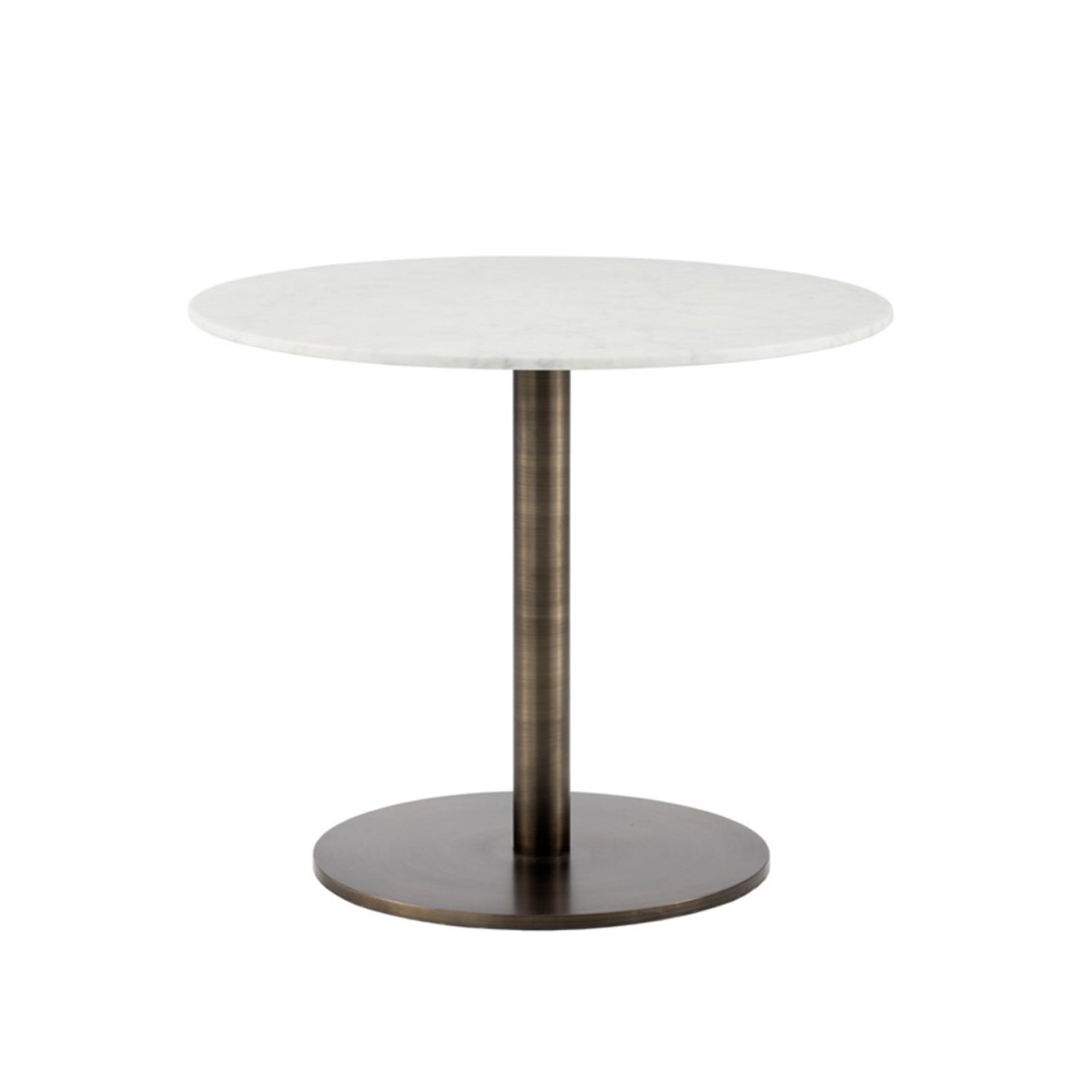 An Art Deco inspired round bistro table, featuring a solid carrara marble top with an antique bronze steel base. Perfect for restaurants and smaller kitchen and dining spaces.