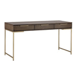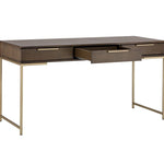 A modern desk designed to add a beautiful touch to office spaces. Crafted from raw umber oak wood veneer with three soft closing drawers for ample storage. Brushed gold iron hardware completes the look.