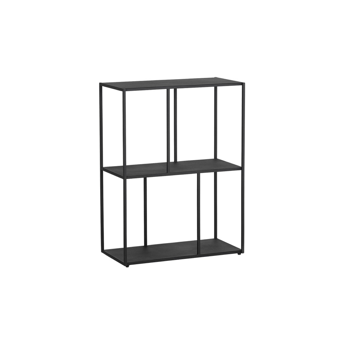 Add style and warmth to living and office spaces with this well-designed low bookcase in matte black iron.