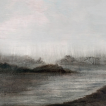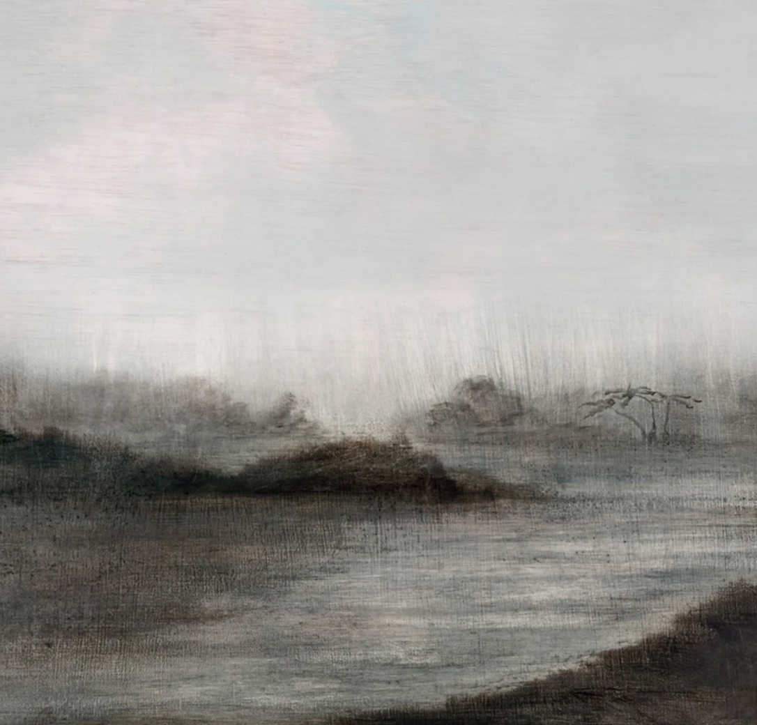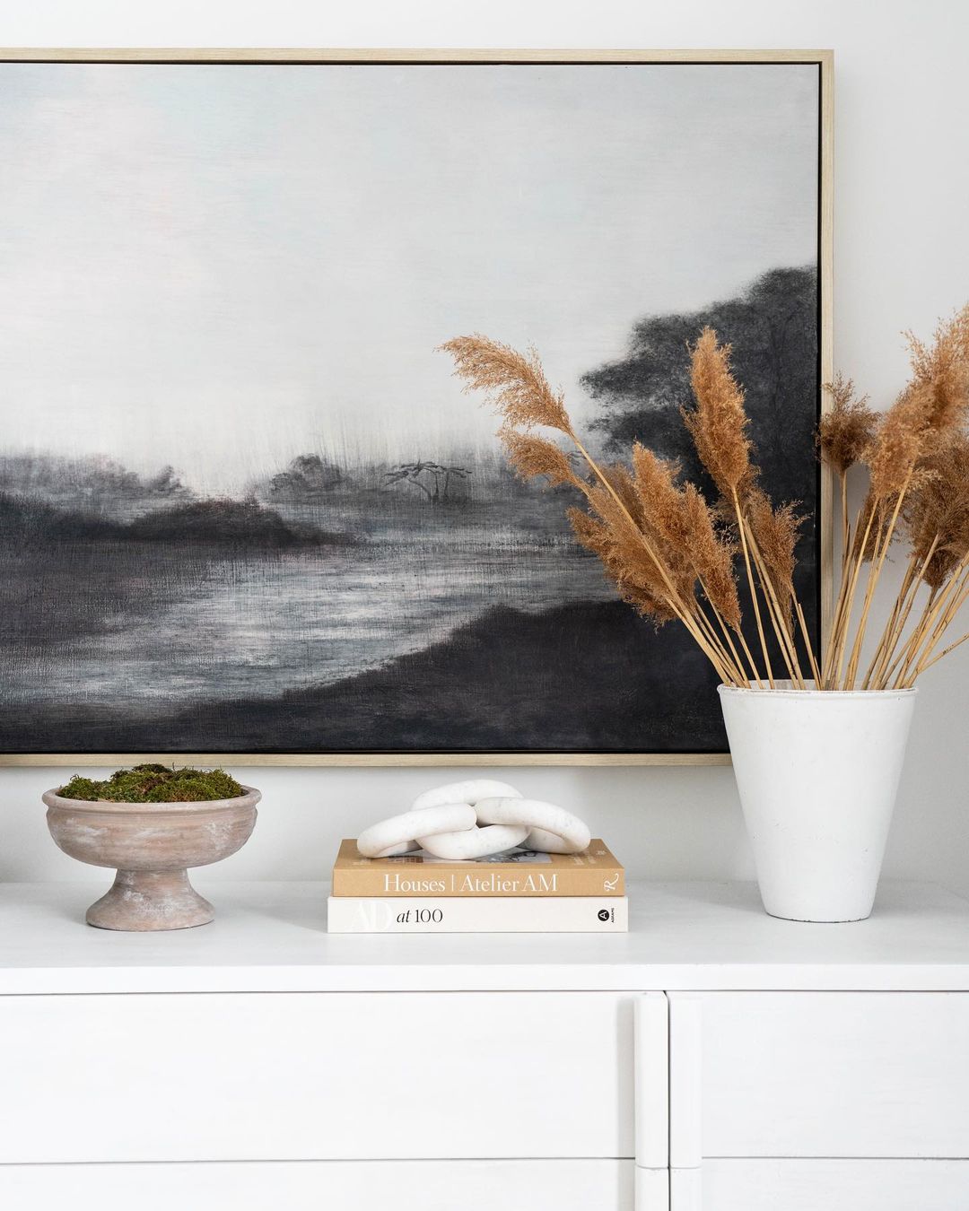 A dark, mysterious piece to add drama and interest to your space. Narrow antique brass floater frame.