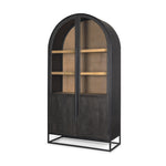 Sloan is a captivating arched curio cabinet meticulously crafted from solid mango wood and black iron metal. Its striking two-toned finish accentuates the elegant arch, with a sleek black metal frame and black wooden door exterior contrasting beautifully with a warm natural light brown stained interior. Display your seasonal and cherished items with sophistication and style behind the solid mango wood and clear glass doors.