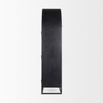 Sloan's arched cabinet doors feature black wood and smooth, clear glass