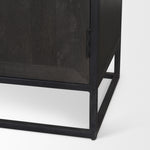 Constructed from a matte black iron metal frame that encases a warm, light brown mango wood interior with black mango wood doors and smooth, clear glass.
