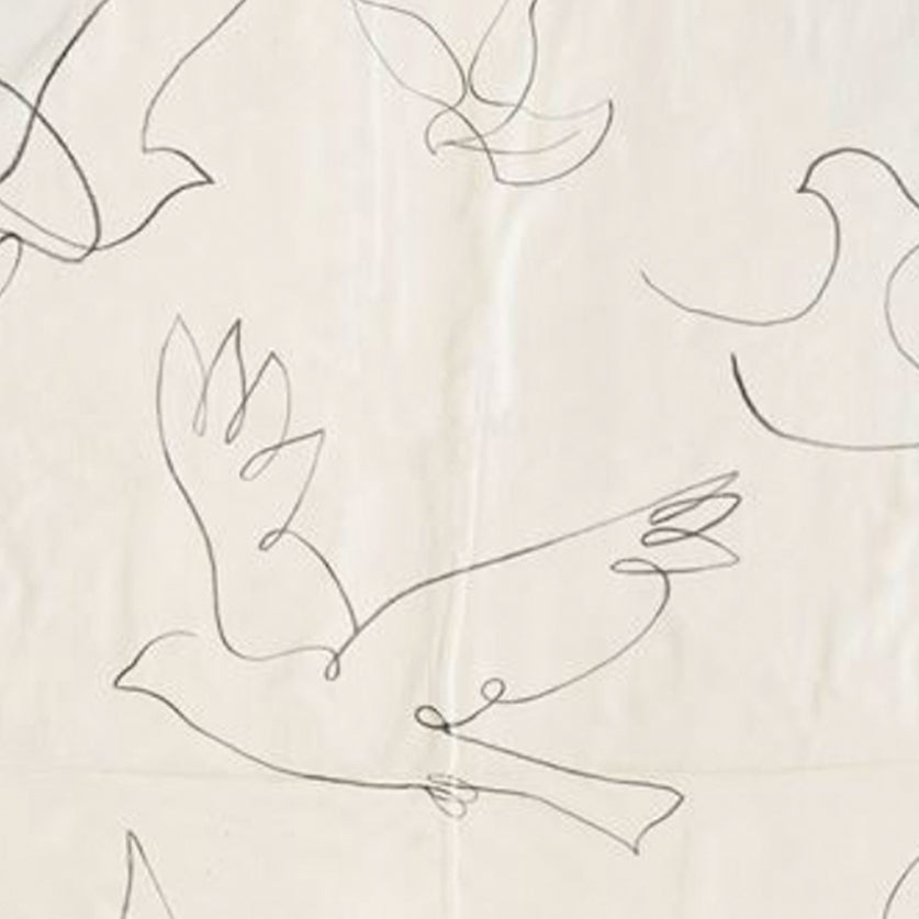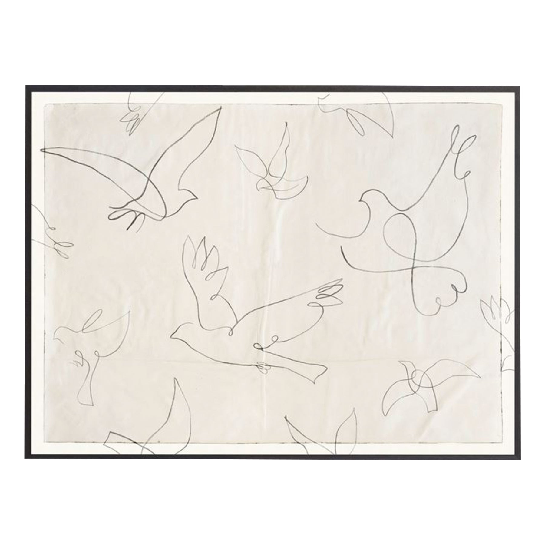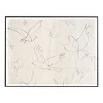 Mid-Century inspired, playful birds in flight are rendered on textured paper. Framed in a dark brown wood. Great as an addition to a gallery grouping.