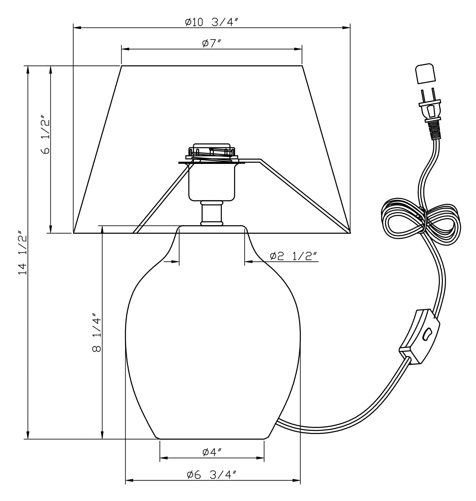 Dimensions: 6.75" W, 14.5″H; Shade: 7″ø(t) x 10.75″ø(b) x 6.5″H
