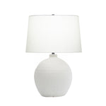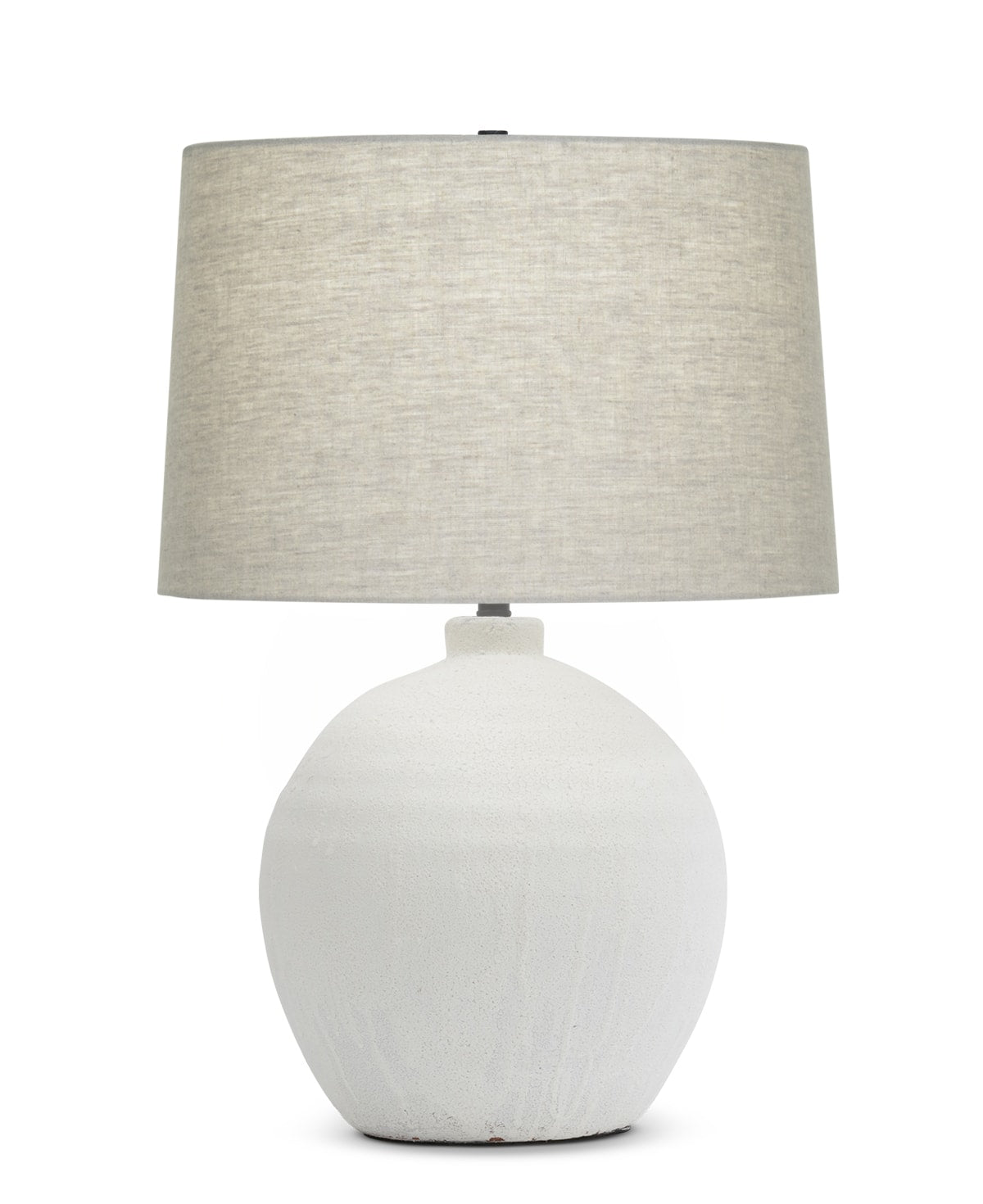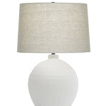 The Trudelle Table Lamp pairs a dramatic ceramic base with an off-white linen drum shade. The gently mottled white finish on the ceramic base lends a rustic appeal to the lamp that will add texture and interest to your home decor.