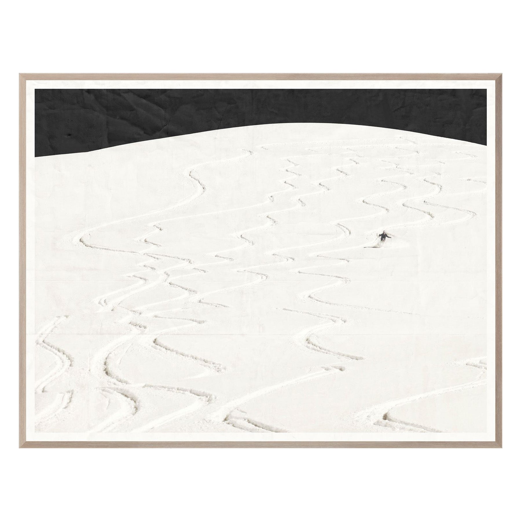 Black and white photography at its best! This dramatic ski hill photograph will have you leaning into the curves. The slice of solid black atop the image balances with the subtle detail of the skier and her beautifully undulating lines in the snow. Finished in a handsome angled light wood profile.