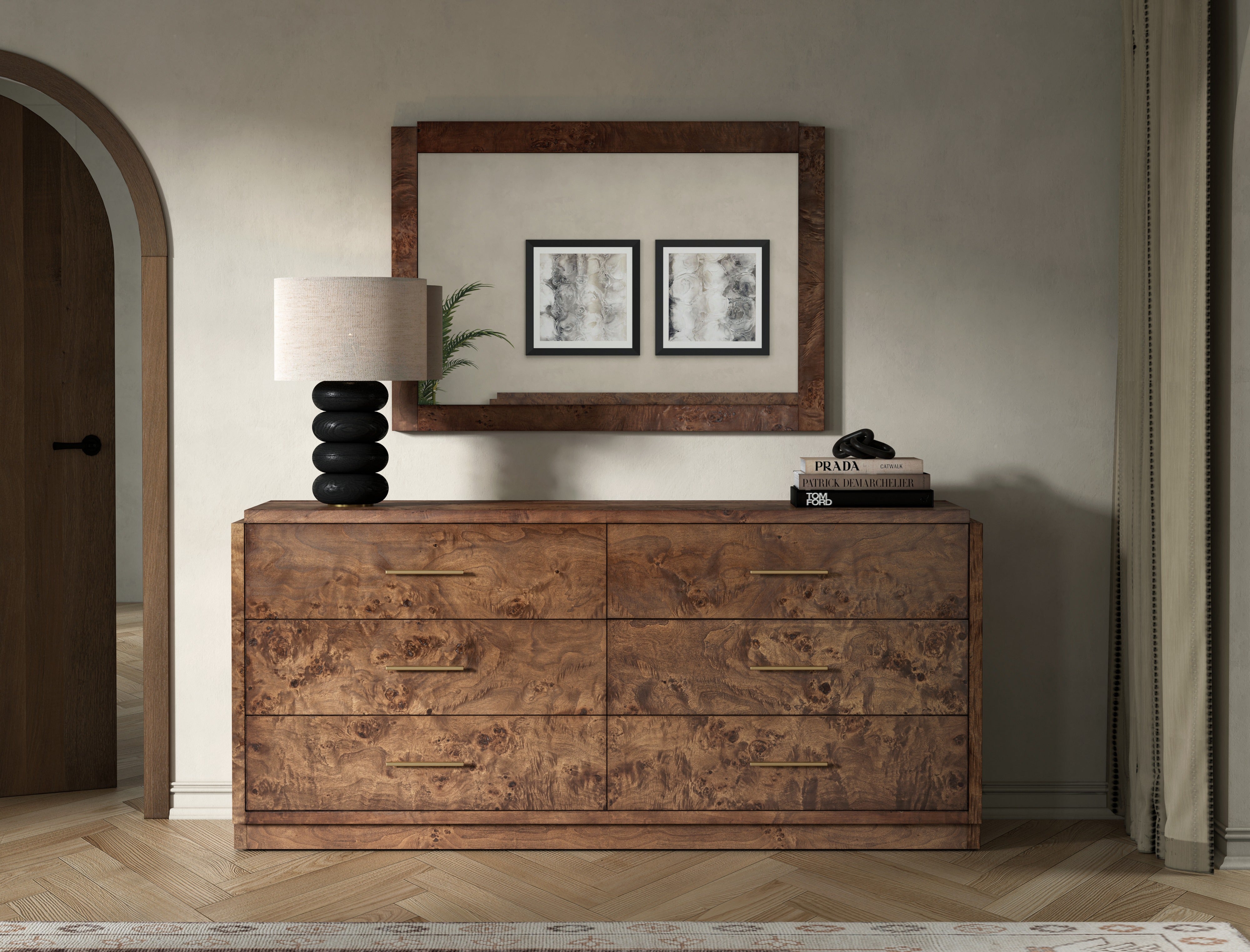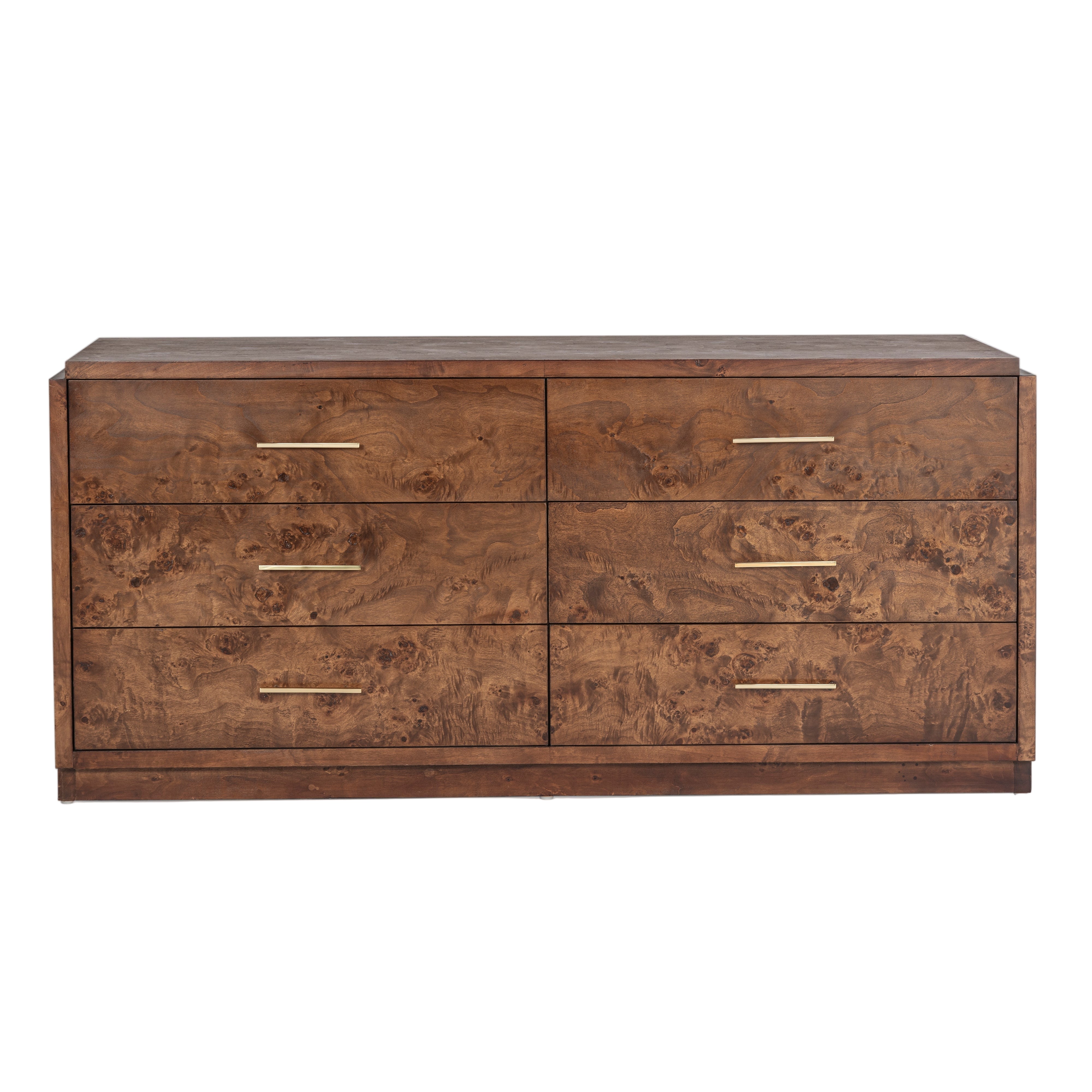 The Snipes Burl 6 Drawer dresser is a beautiful combination of engineered hardwood and veneer, accentuated by brass hardware. With its unique texture and design, this piece is showstopper for any room.