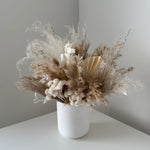 • Recette florale : pampas, palmetto blanc taillé, helichrysums, ruscus et lagurus