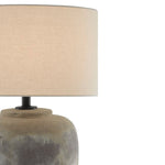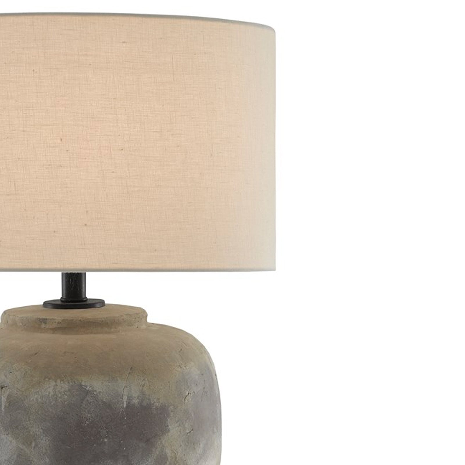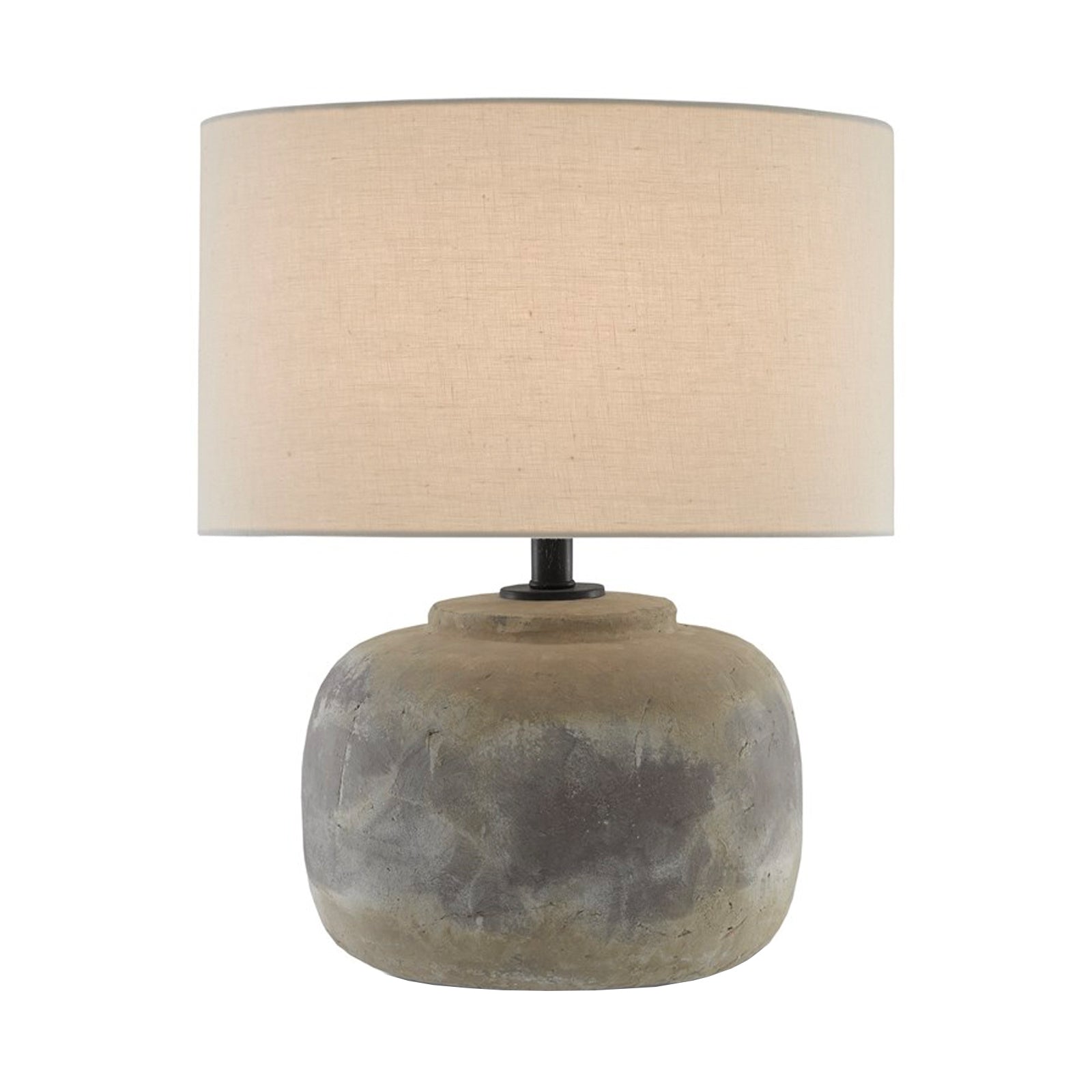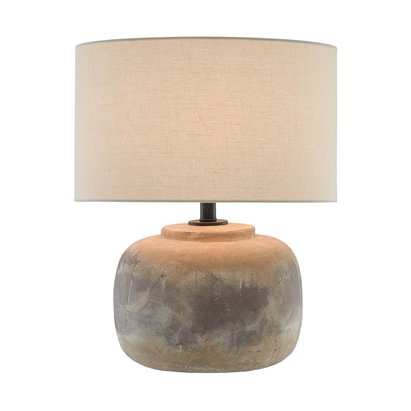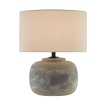 The Linette table lamp has a distressed antique earth finish on its concrete body and topped with a light beige linen shade.