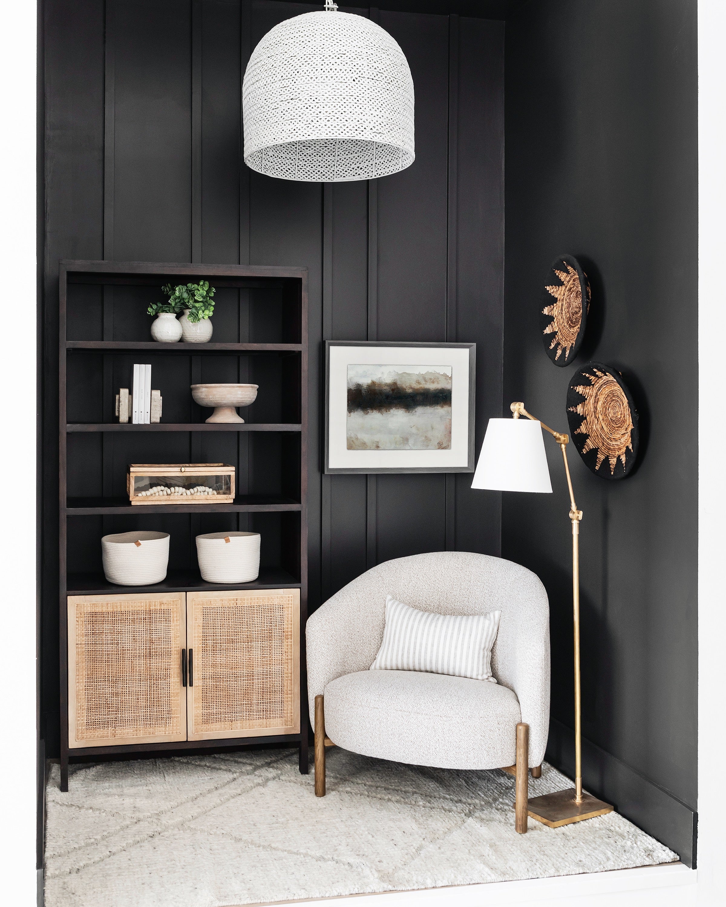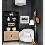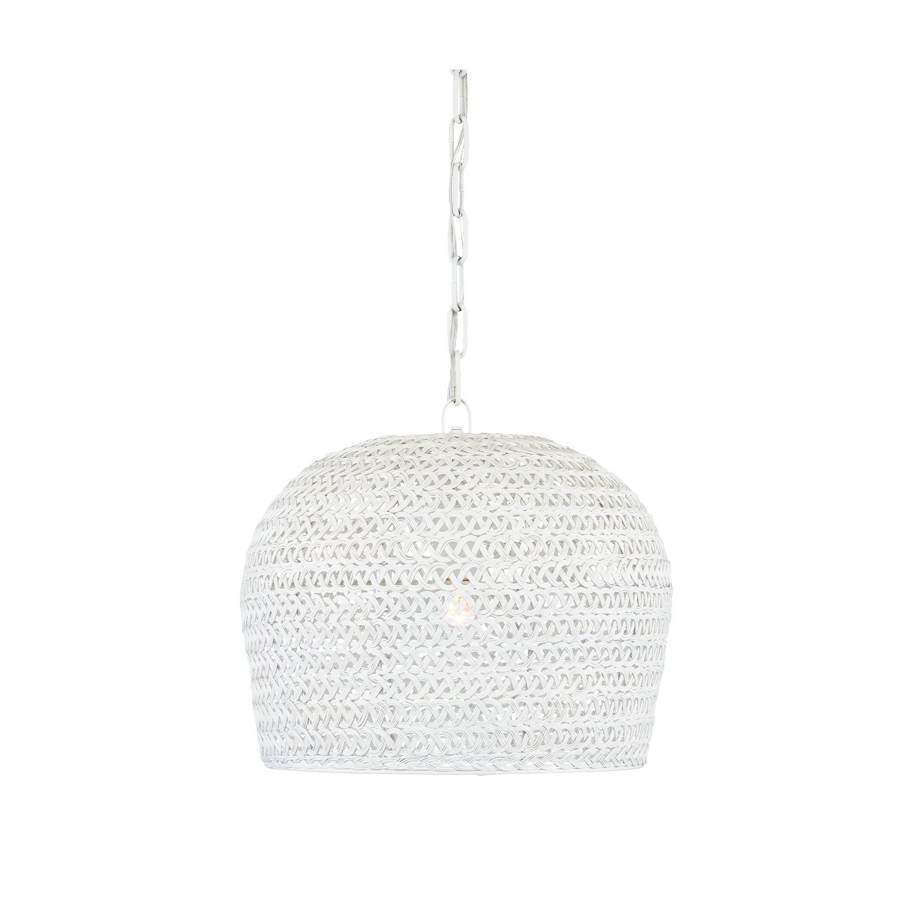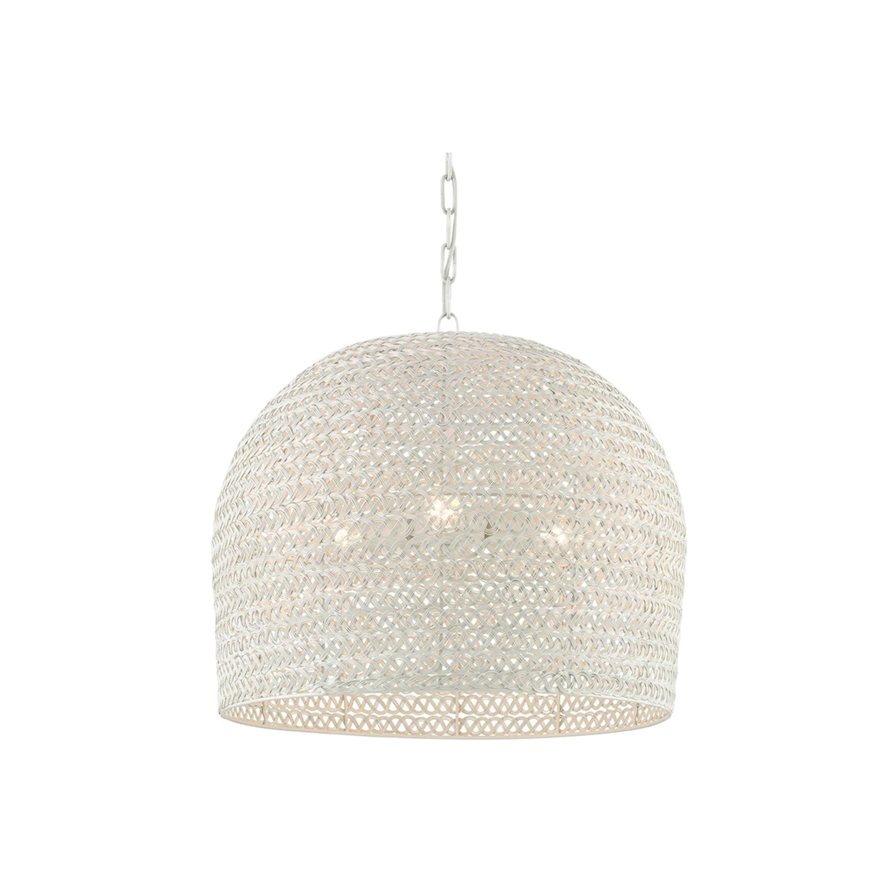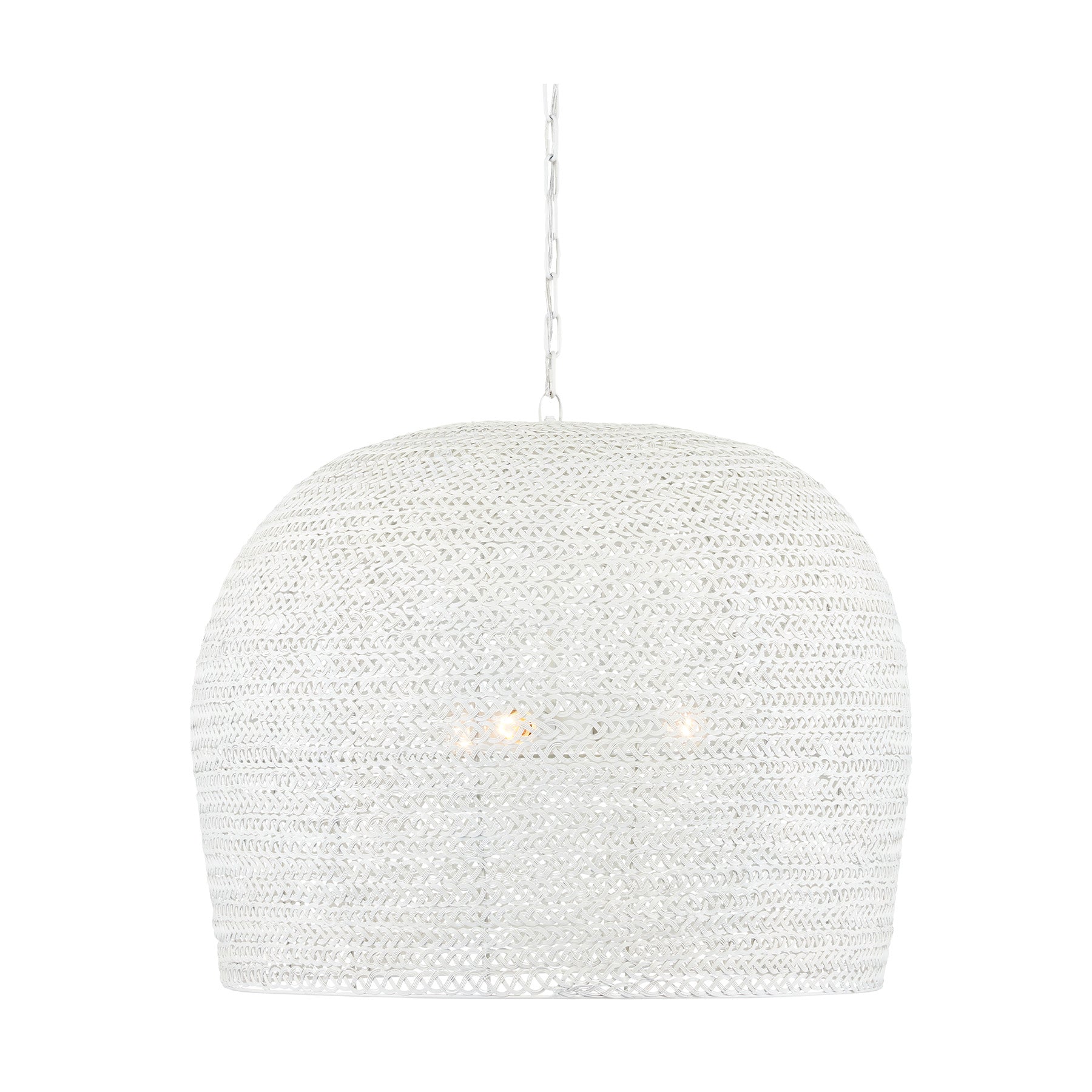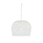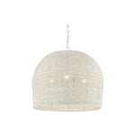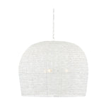 The Ernest chandelier may appear to be woven from a natural plant material, but it is made of iron in a white finish to make it one of our offerings that illustrates the skills our craftspeople bring to their work. When the white chandelier is illuminated, textural patterns will enliven surrounding surfaces.
