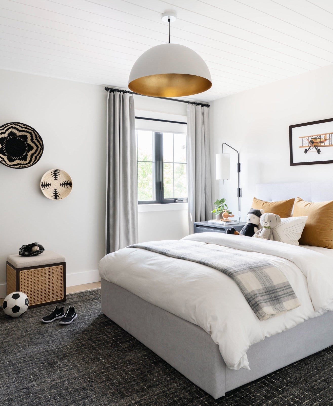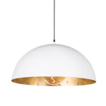 A simple dome shade brings sleek minimalism to the mix. Featuring a gold-leafed finish on the shade’s interior, this gives the room a warm glow and a sophisticated pop of contrast.