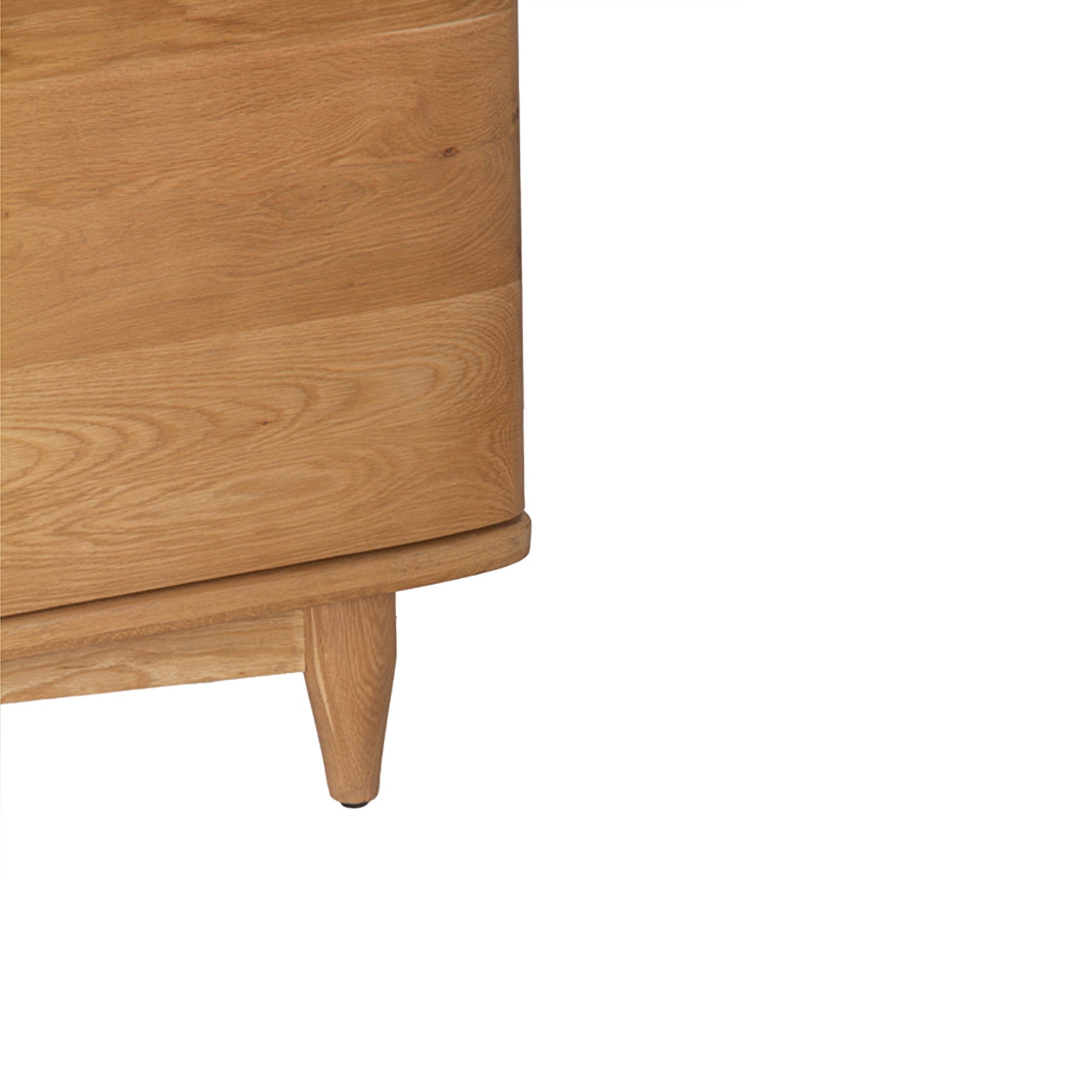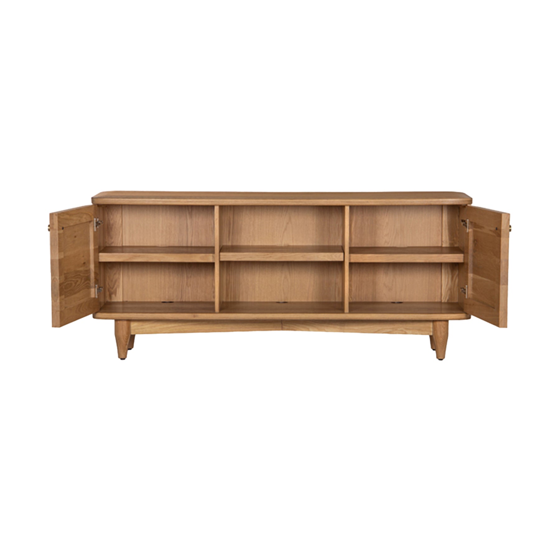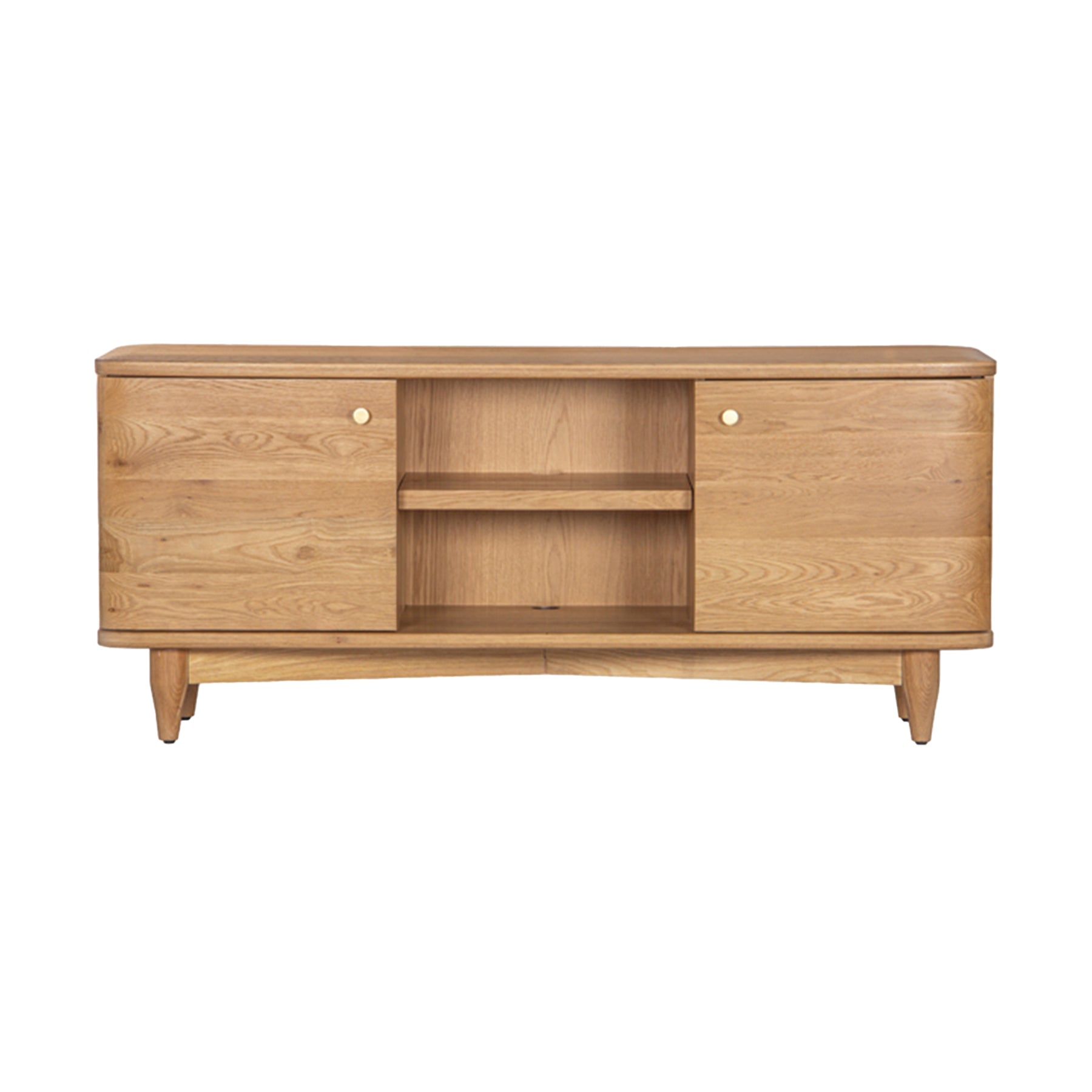The Dandie media stand is crafted from FSC Certified Oak Wood, featuring a sculptured profile with soft edges. The textured surface is finished in a water based, Natural oil finish to highlight the natural beauty of the grain. 2 hinged doors conceal 1 adjustable shelves, with cut outs for wire management and ventilation.